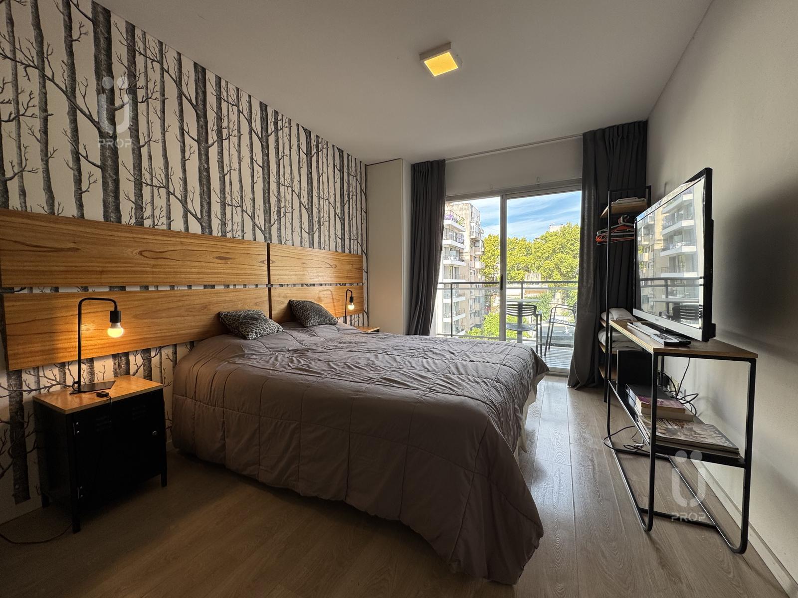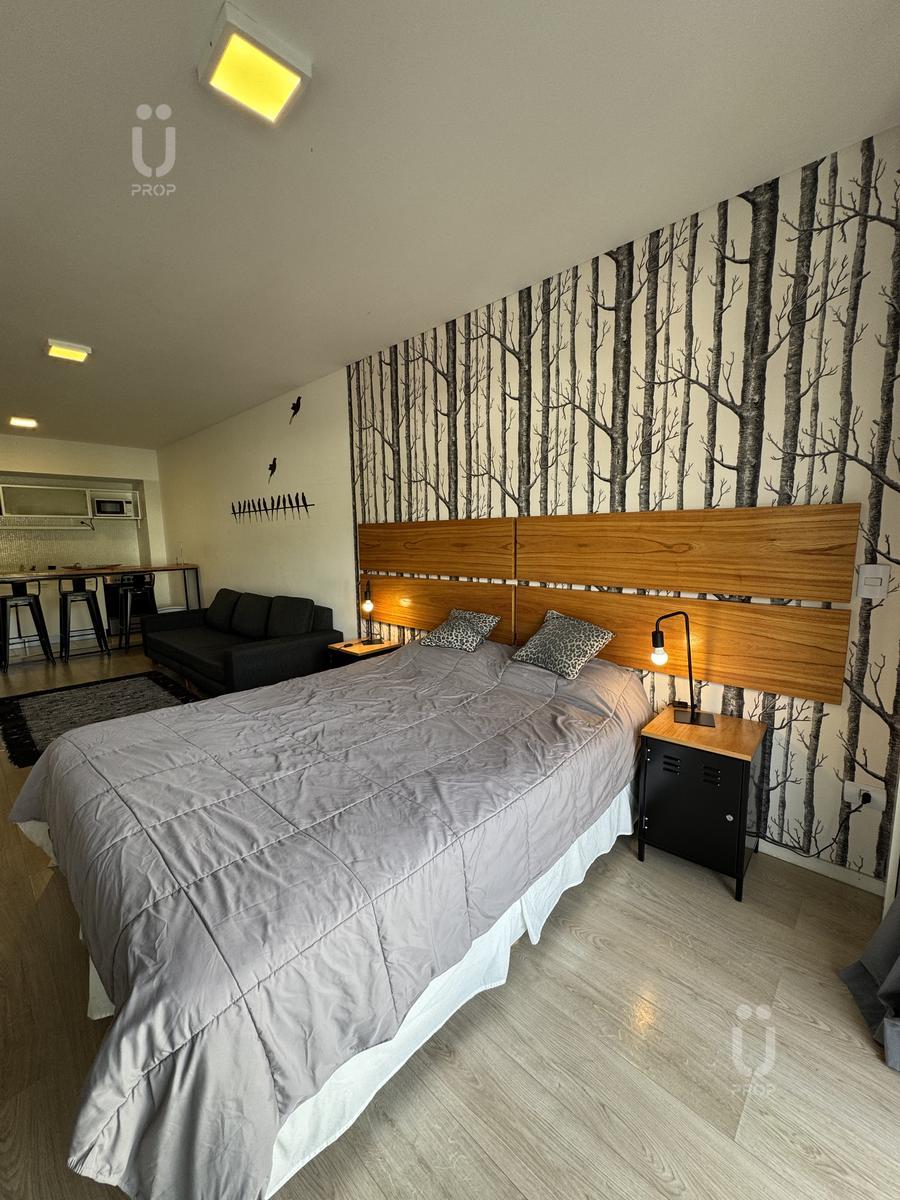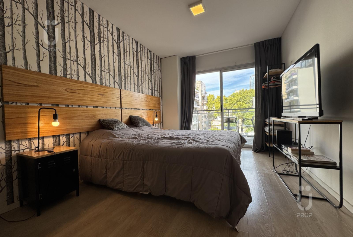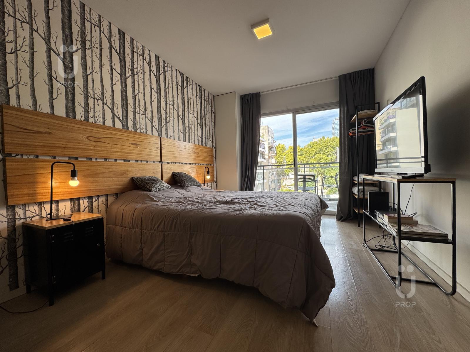 En el sector dormitorio se encuentra una cama de dos plazas tipo sommier, mesa de luz con veladores y respaldo de cama. Posee puertas ventana corredizas con cortinas blackout que conectan al balcón, brindando excelente luz natural y muy buena ventilación.