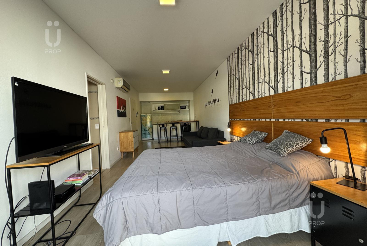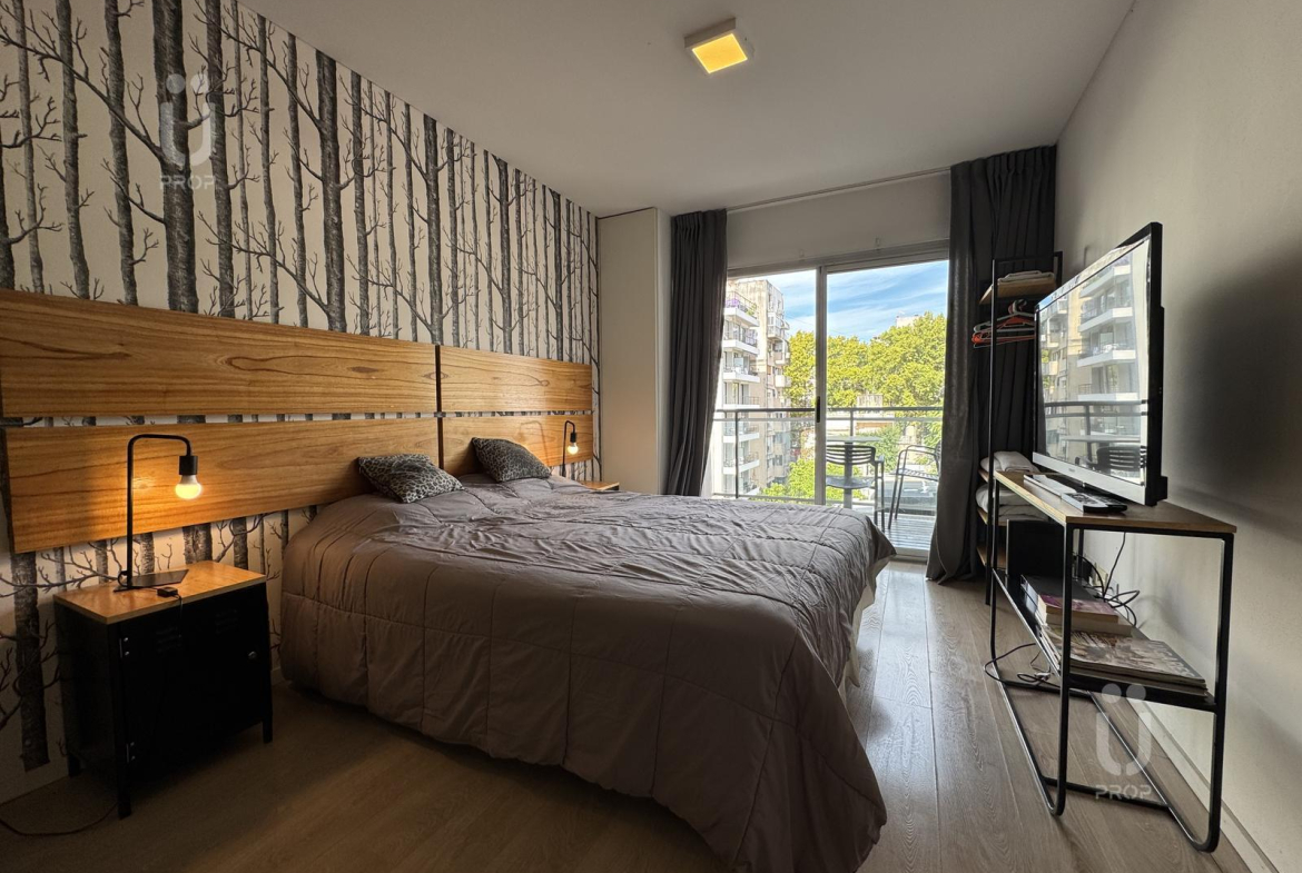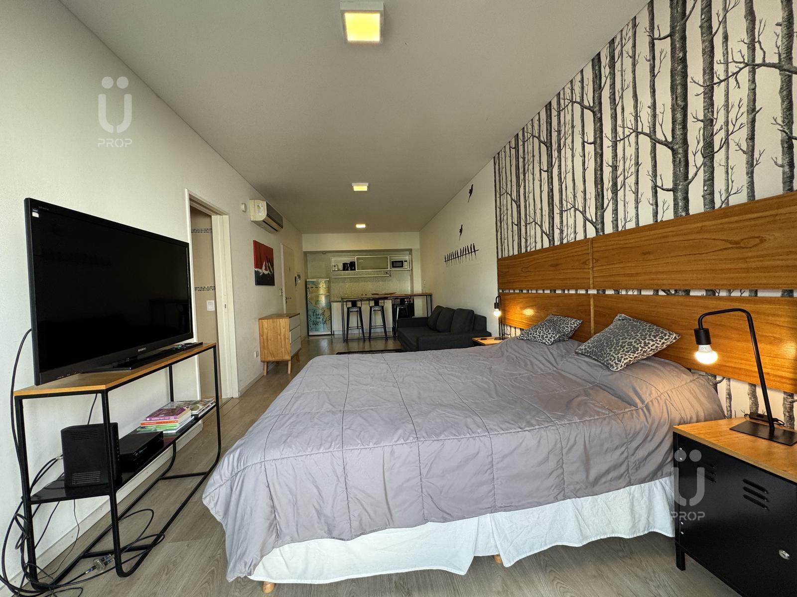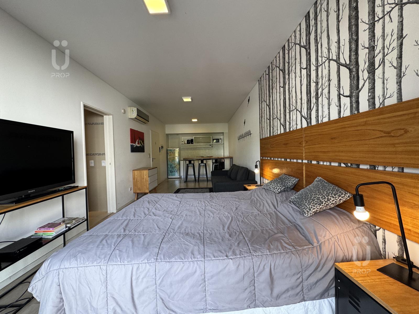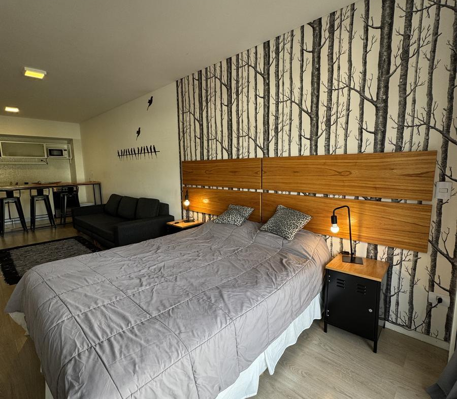 En el sector dormitorio se encuentra una cama de dos plazas tipo sommier, mesa de luz con veladores y respaldo de cama. Posee puertas ventana corredizas con cortinas blackout que conectan al balcón, brindando excelente luz natural y muy buena ventilación.
