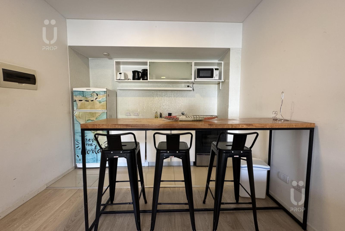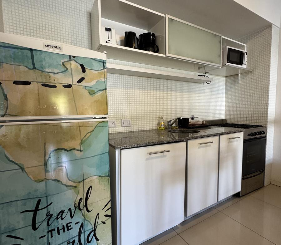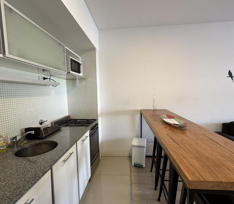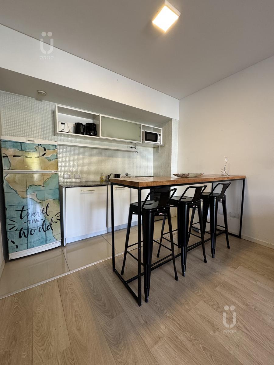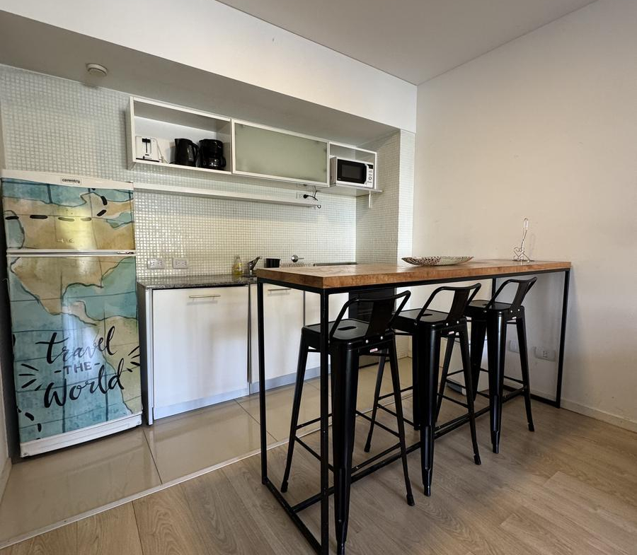 La cocina es integrada y funcional, con barra desayunadora de estilo industrial y tres banquetas altas que dividen los espacios. Está completamente equipada con heladera con freezer, bacha monocomando con agua fría y caliente, tostadora, pava eléctrica, cafetera, horno, microondas, licuadora, multiprocesadora y cocina a gas de cuatro hornallas con horno. Incluye todos los utensilios necesarios para el día a día.