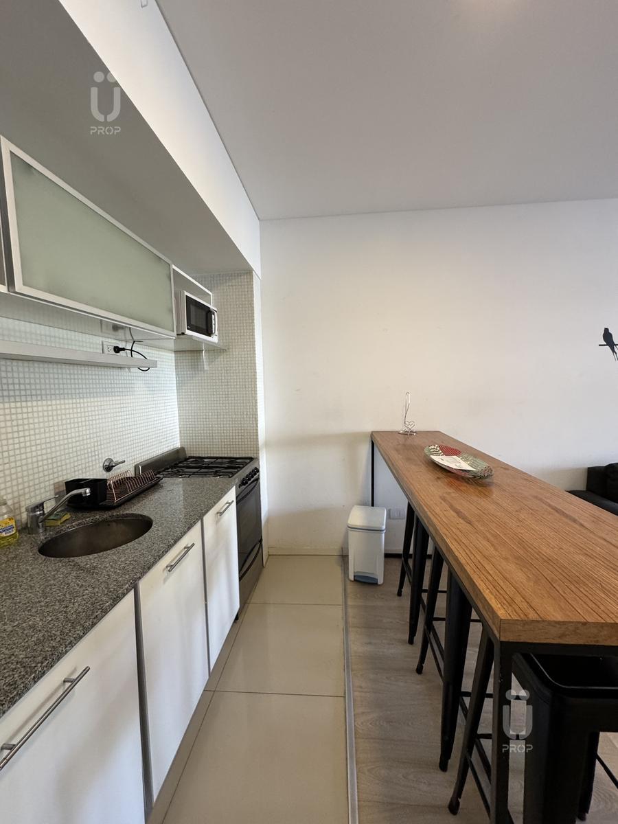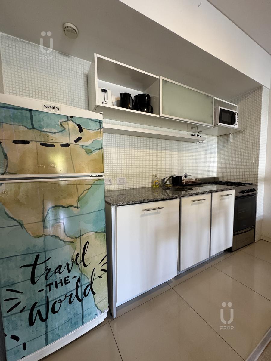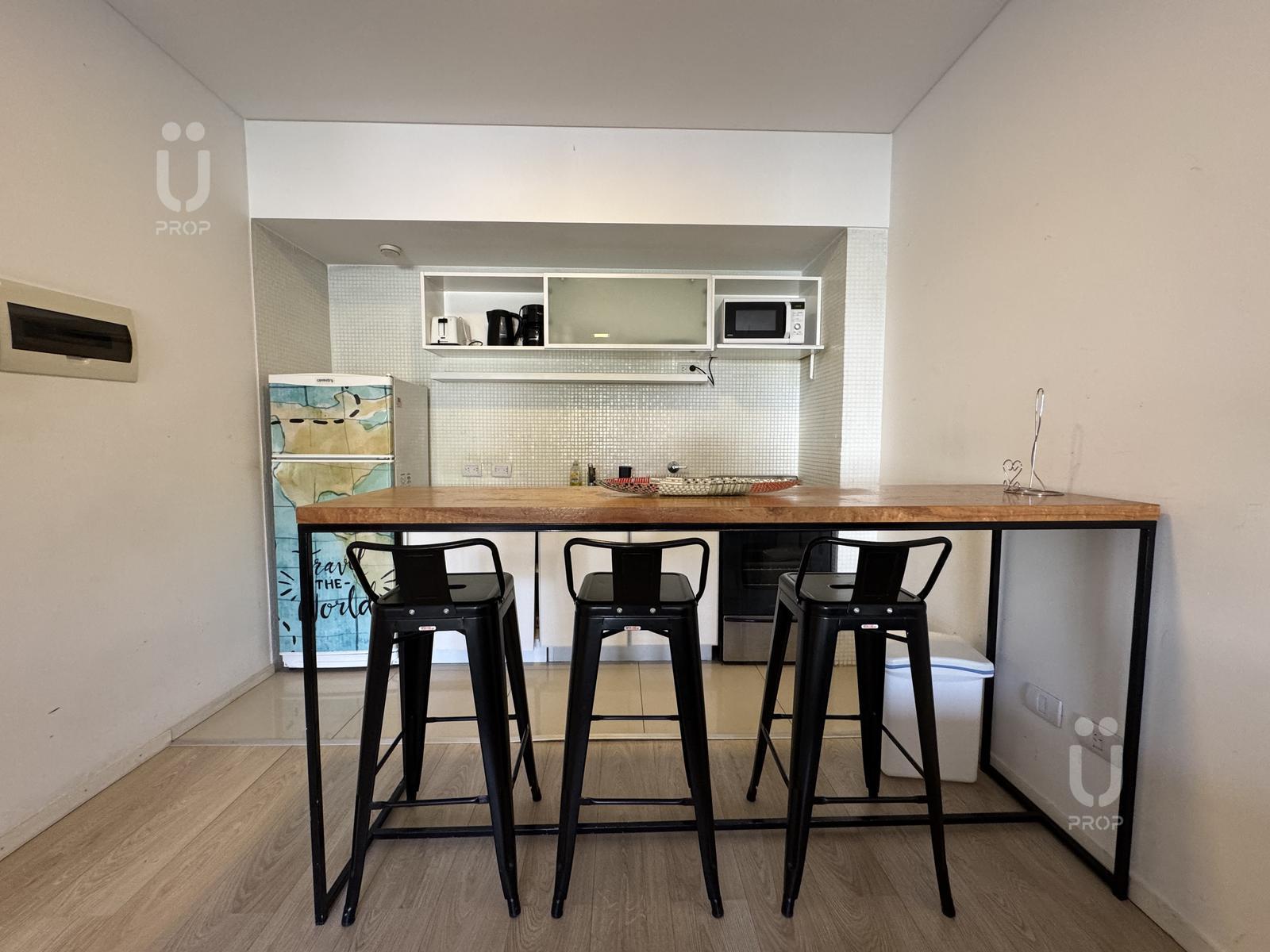 La cocina es integrada y funcional, con barra desayunadora de estilo industrial y tres banquetas altas que dividen los espacios. Está completamente equipada con heladera con freezer, bacha monocomando con agua fría y caliente, tostadora, pava eléctrica, cafetera, horno, microondas, licuadora, multiprocesadora y cocina a gas de cuatro hornallas con horno. Incluye todos los utensilios necesarios para el día a día.