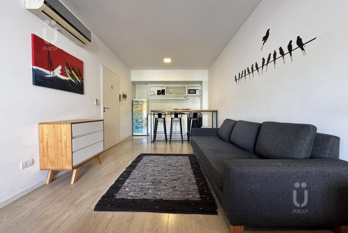La propiedad cuenta con un amplio y luminoso ambiente principal, equipado con sofá de tres cuerpos muy cómodo, alfombra de piso y rack cajonera con tres cajones. Dispone de Smart TV de 55 pulgadas, servicio de Internet Wi-Fi y cable, perchero y organizador de estilo industrial, además de aire acondicionado split frío/calor.