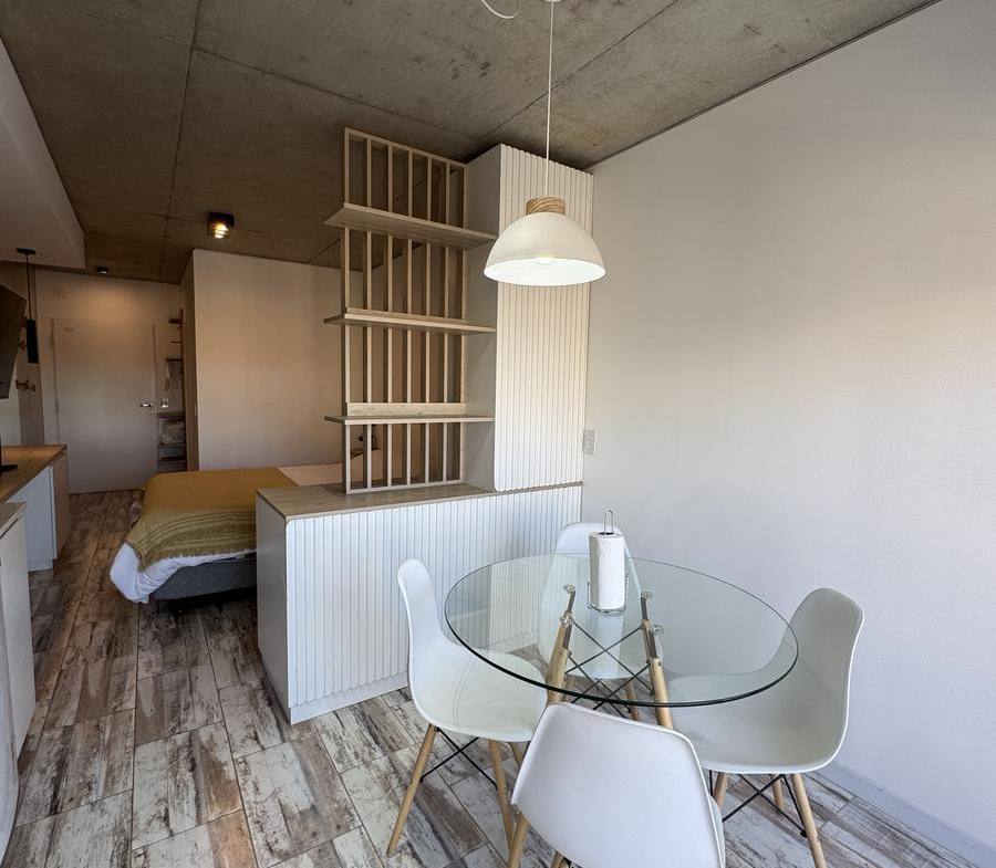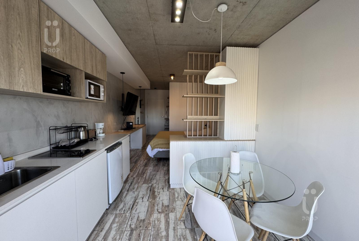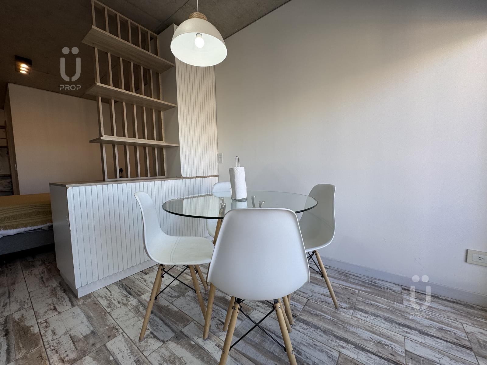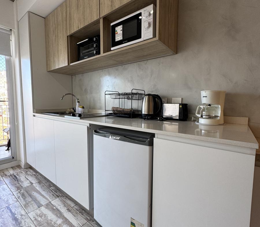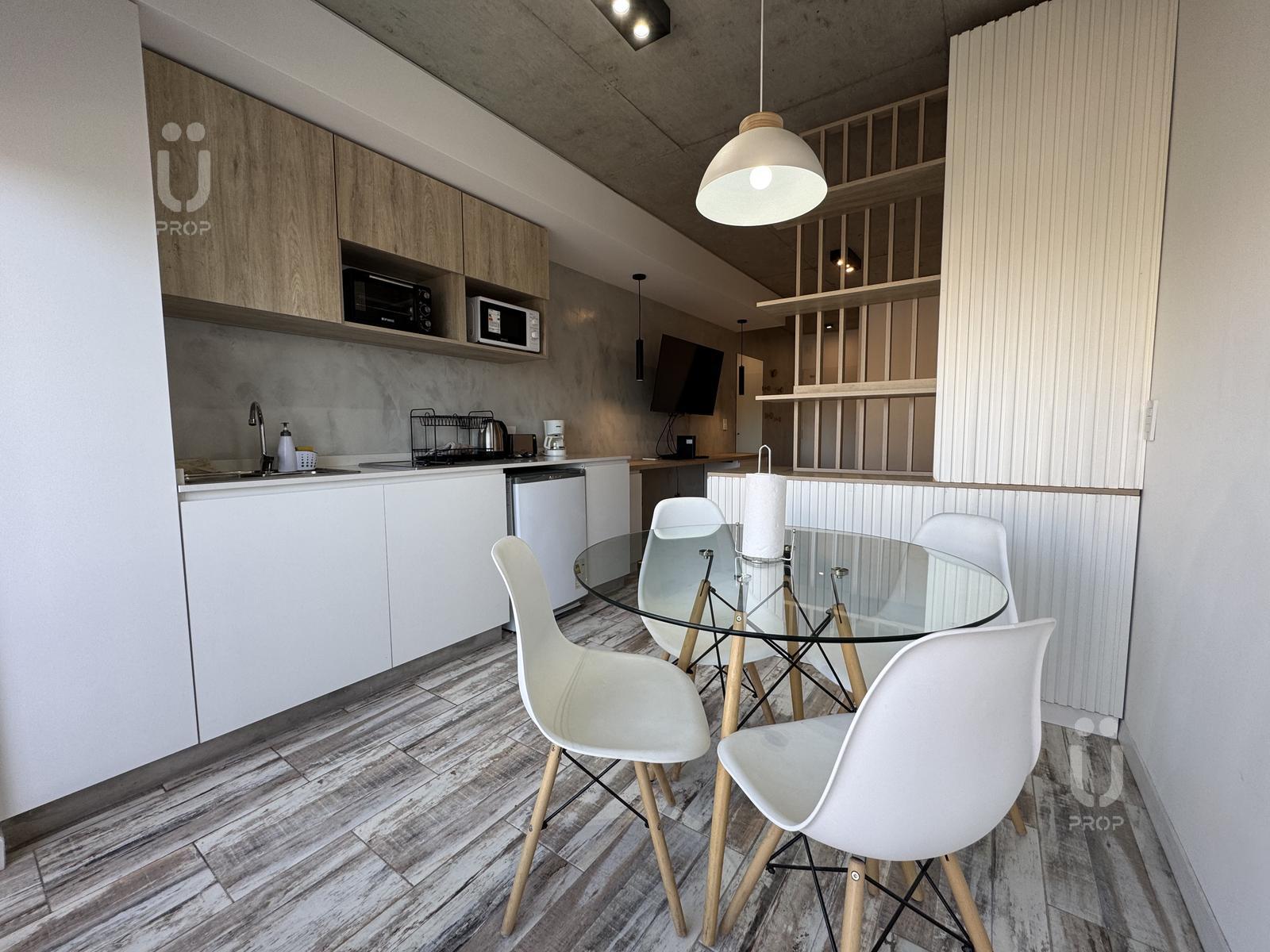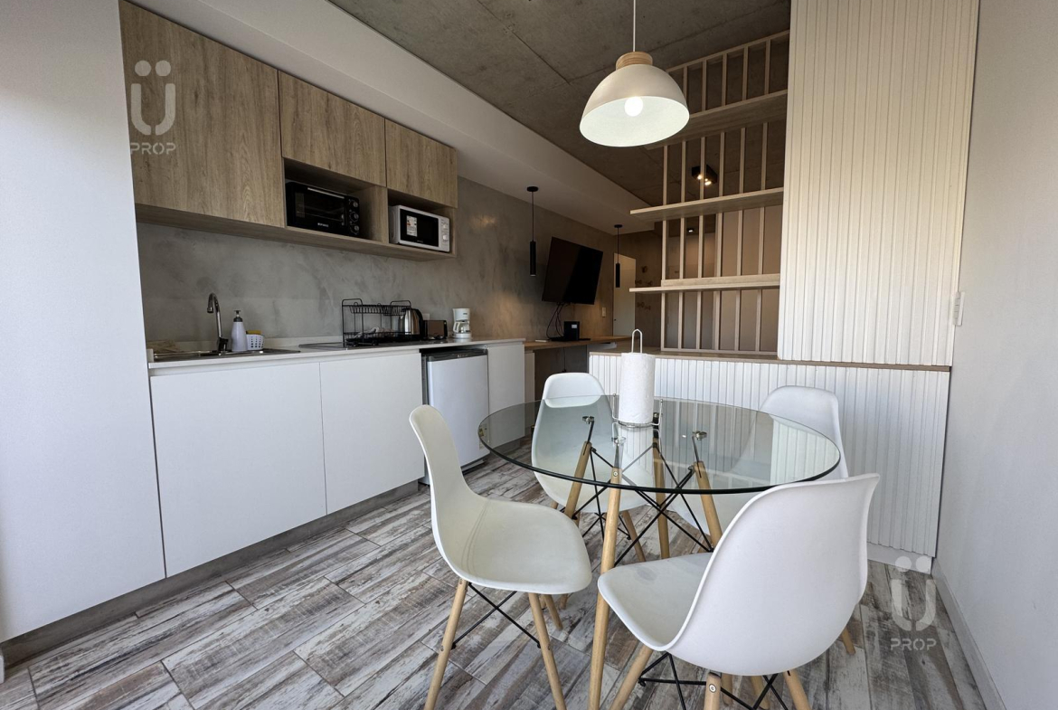 Esta propiedad cuenta con mesa circular de vidrio nórdica con cuatro sillas, la cocina es integrada, cuenta con frigobar, pava eléctrica, cafetera, tostadora, horno microondas y horno eléctrico, bacha monocomando con agua fría y caliente, alacenas y alacenas bajo mesada, y posee un mueble divisor de ambiente.