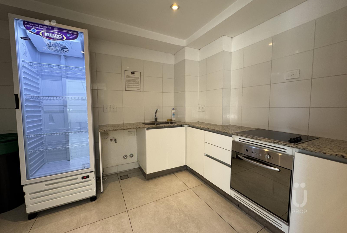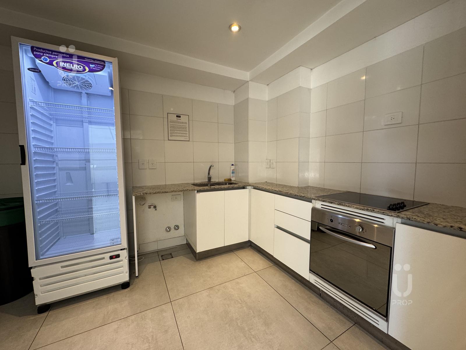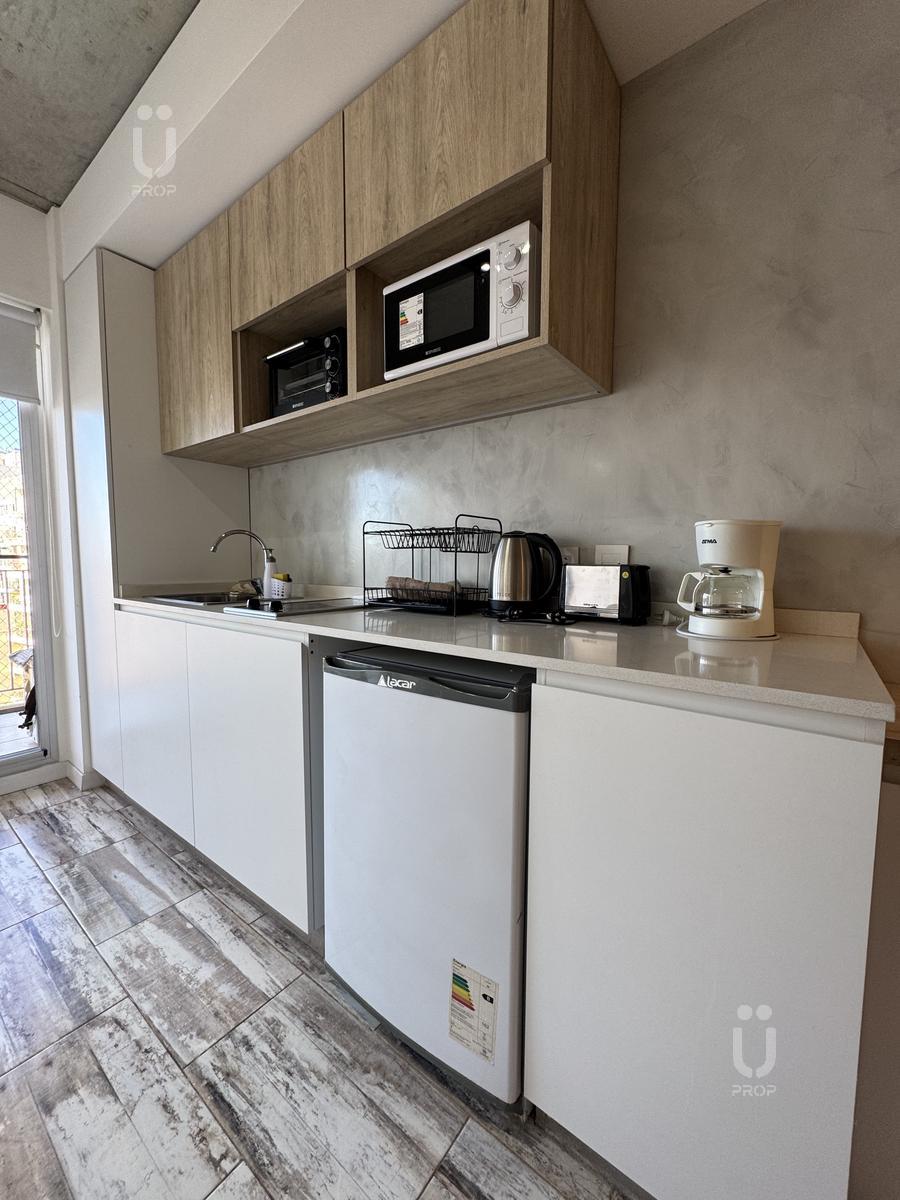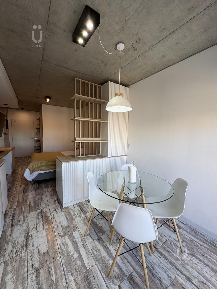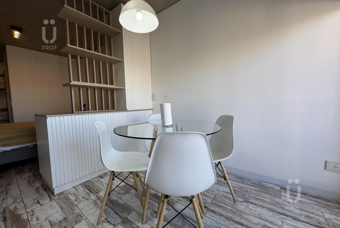 Esta propiedad cuenta con mesa circular de vidrio nórdica con cuatro sillas, la cocina es integrada, cuenta con frigobar, pava eléctrica, cafetera, tostadora, horno microondas y horno eléctrico, bacha monocomando con agua fría y caliente, alacenas y alacenas bajo mesada, y posee un mueble divisor de ambiente.