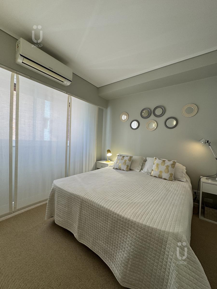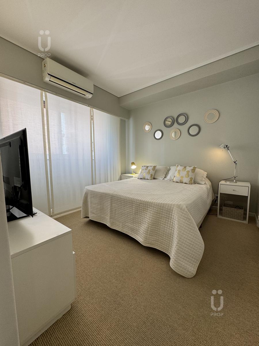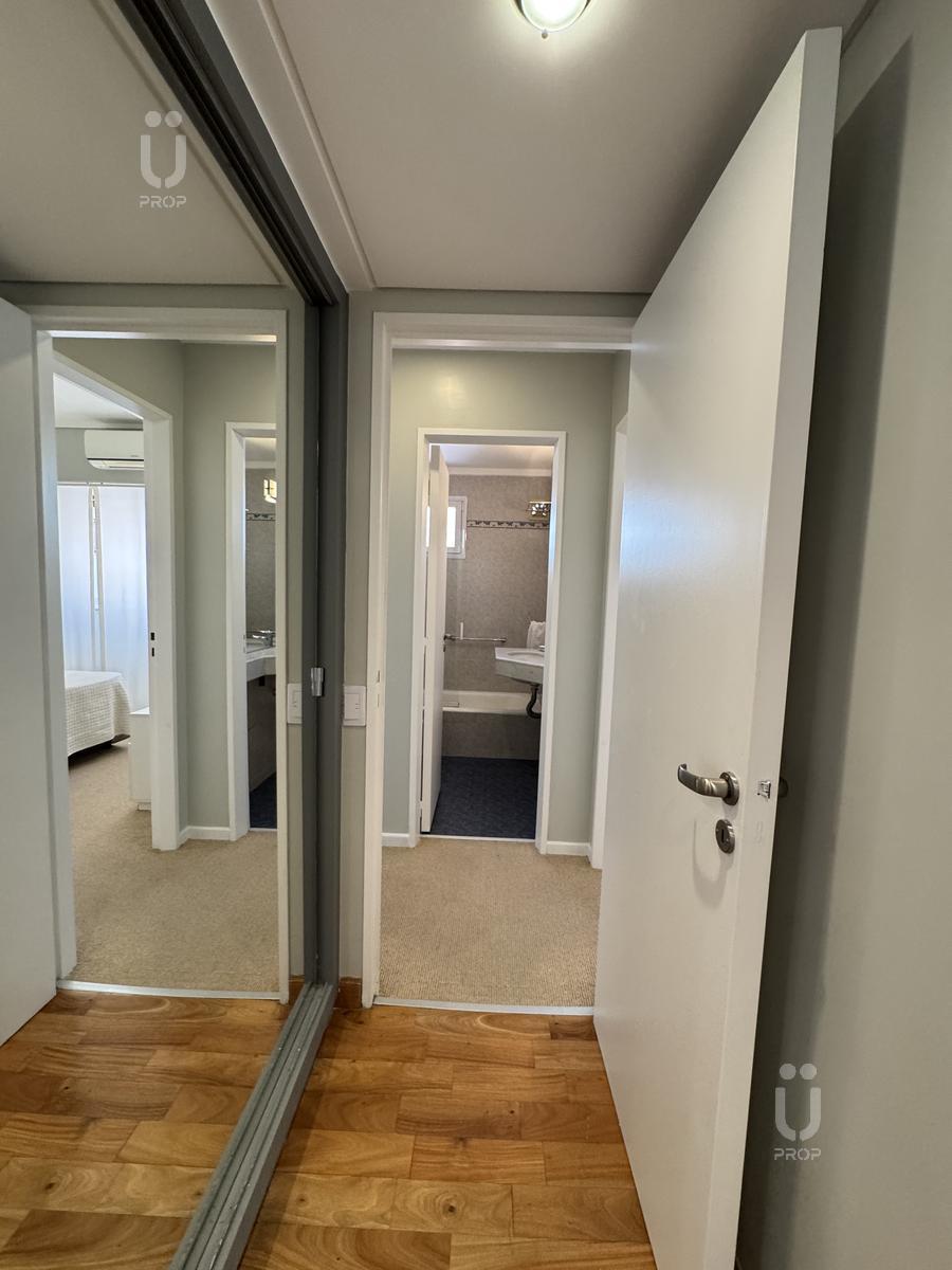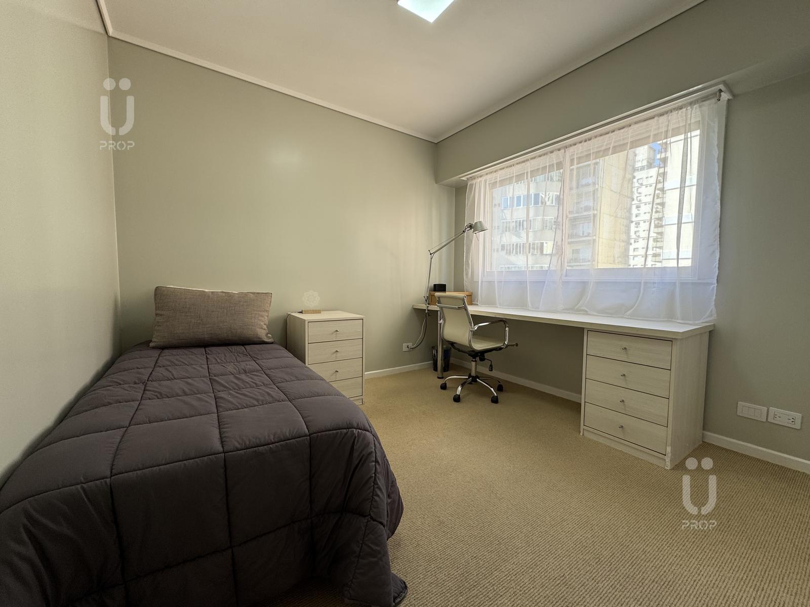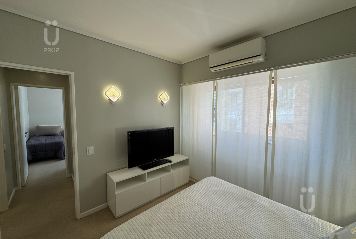 El pasillo de distribución nos conduce al sector de las habitaciones en donde se encuentra un baño completo, con bañera y mampara de vidrio. El dormitorio principal cuenta con cama tipo sommier de dos plazas, mesas de luz con veladores, rack TV smart, ventanas con vista al contra frente de la unidad con excelente luz natural y muy buena circulación de aire. Cuenta con placar empotrado y aire acondicionado split frío calor.