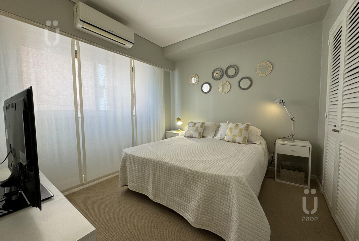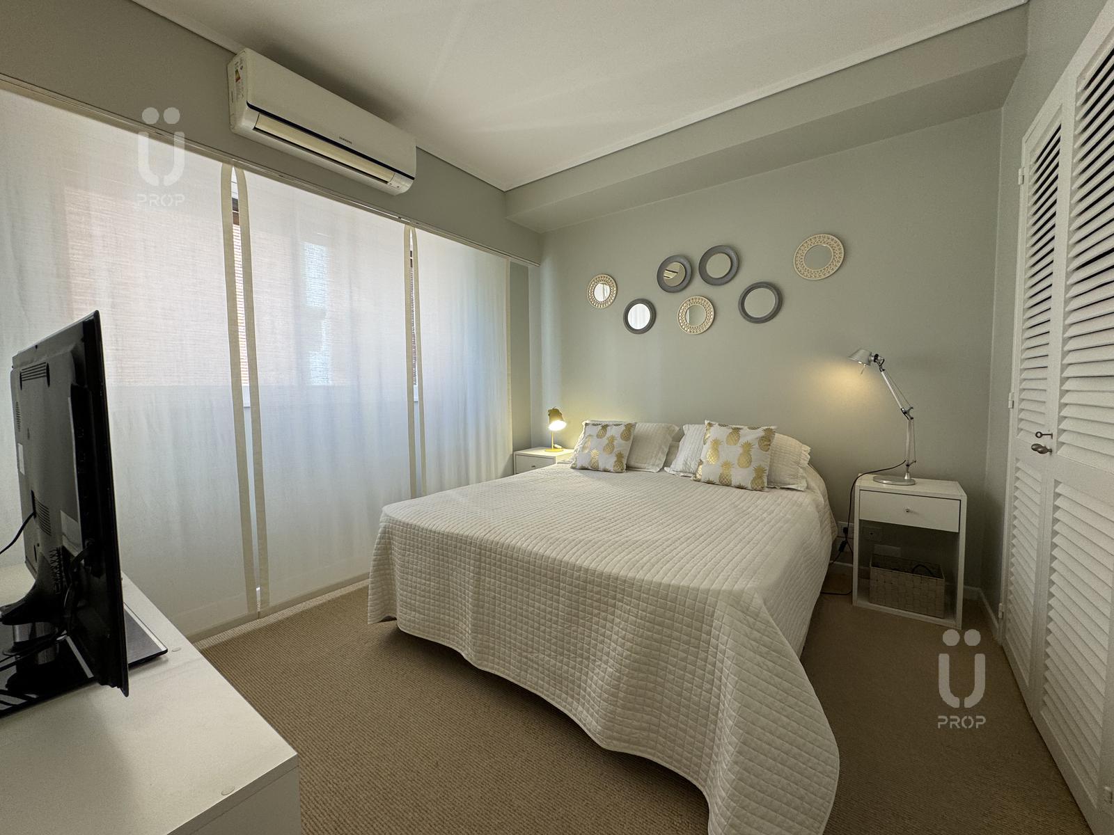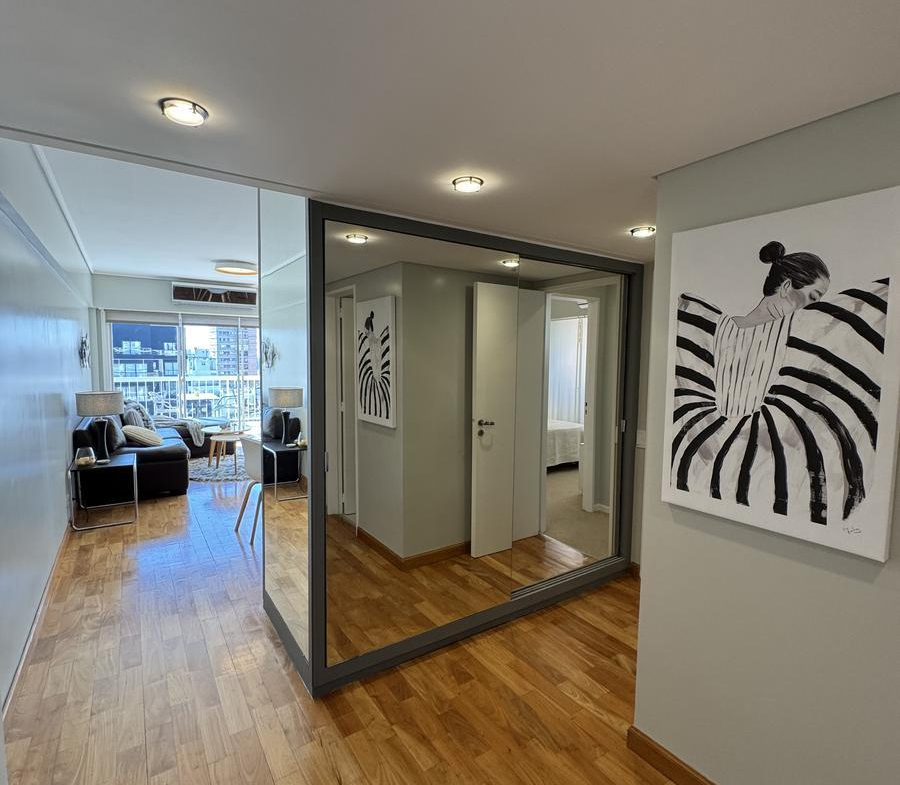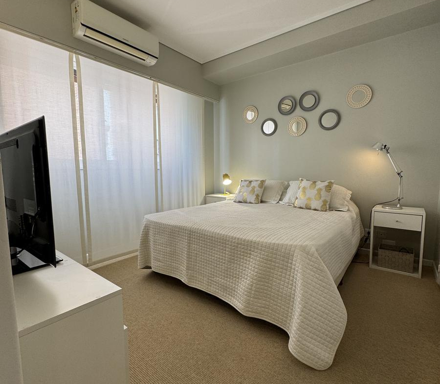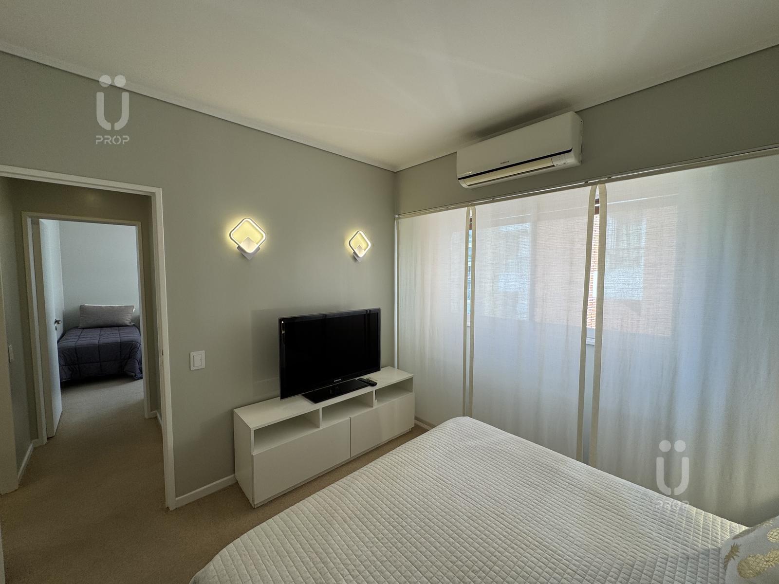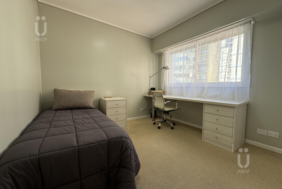 El pasillo de distribución nos conduce al sector de las habitaciones en donde se encuentra un baño completo, con bañera y mampara de vidrio. El dormitorio principal cuenta con cama tipo sommier de dos plazas, mesas de luz con veladores, rack TV smart, ventanas con vista al contra frente de la unidad con excelente luz natural y muy buena circulación de aire. Cuenta con placar empotrado y aire acondicionado split frío calor.