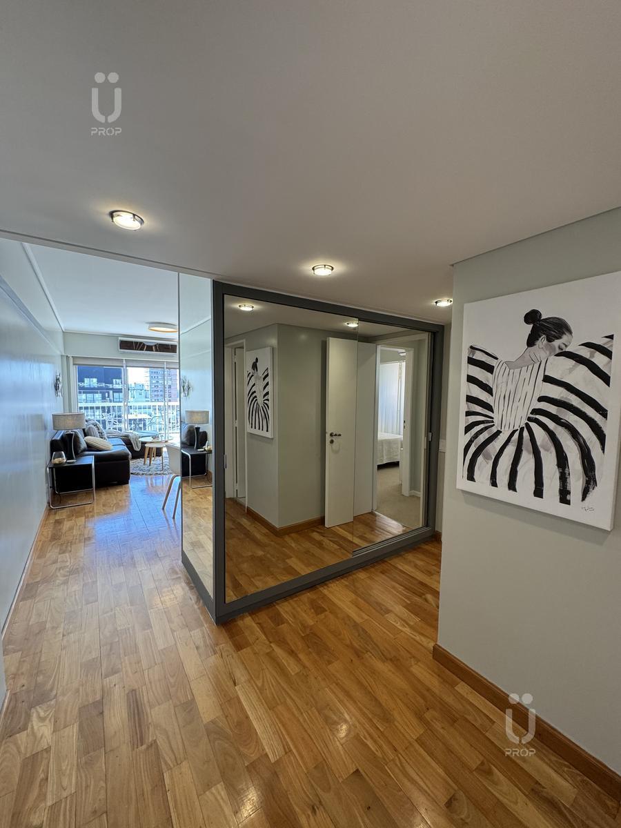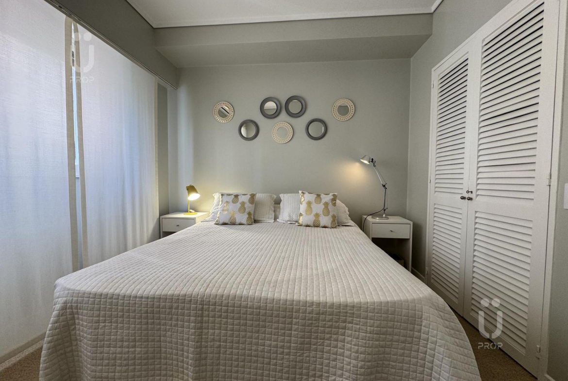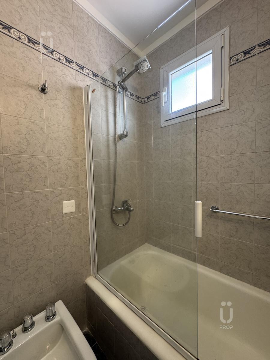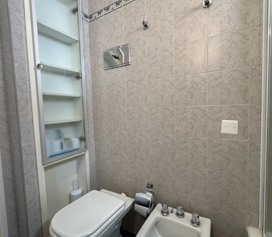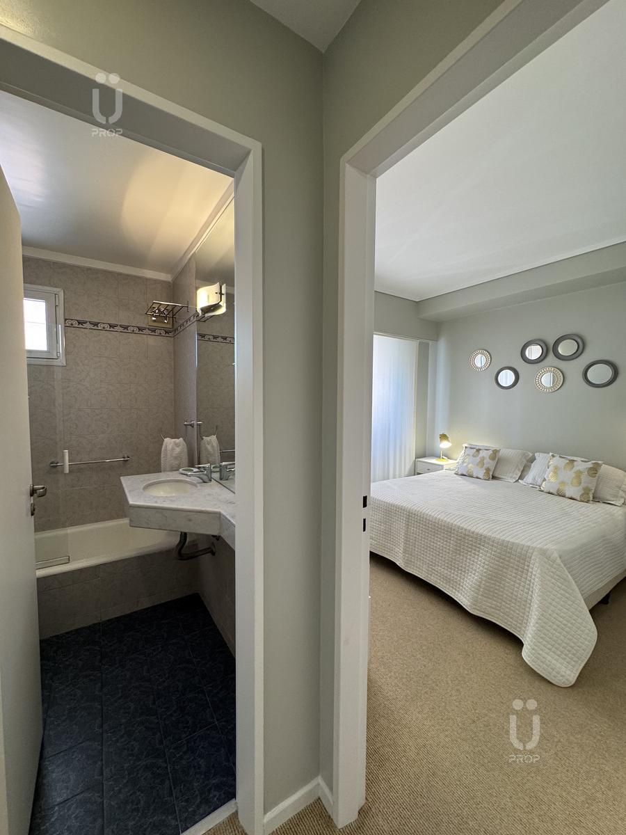 El pasillo de distribución nos conduce al sector de las habitaciones en donde se encuentra un baño completo, con bañera y mampara de vidrio. El dormitorio principal cuenta con cama tipo sommier de dos plazas, mesas de luz con veladores, rack TV smart, ventanas con vista al contra frente de la unidad con excelente luz natural y muy buena circulación de aire. Cuenta con placar empotrado y aire acondicionado split frío calor.