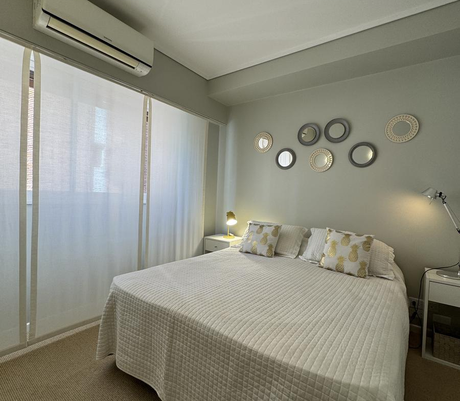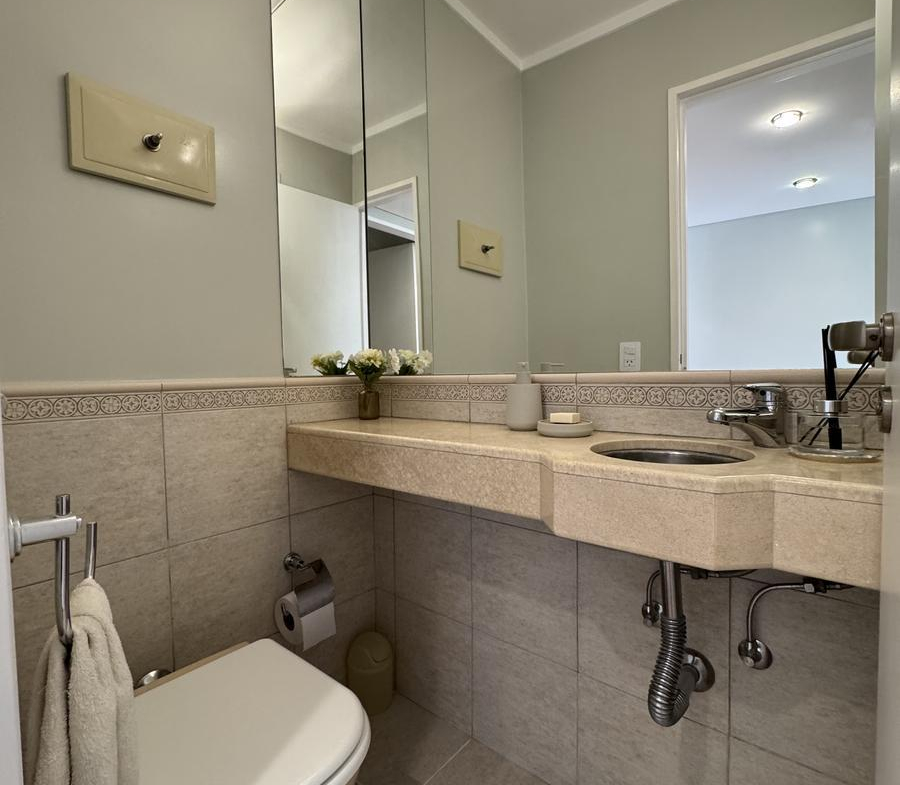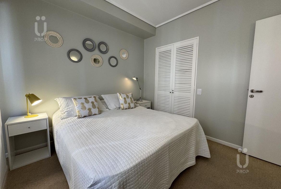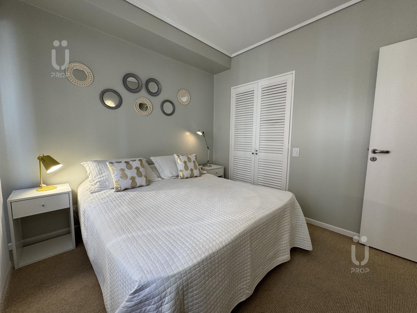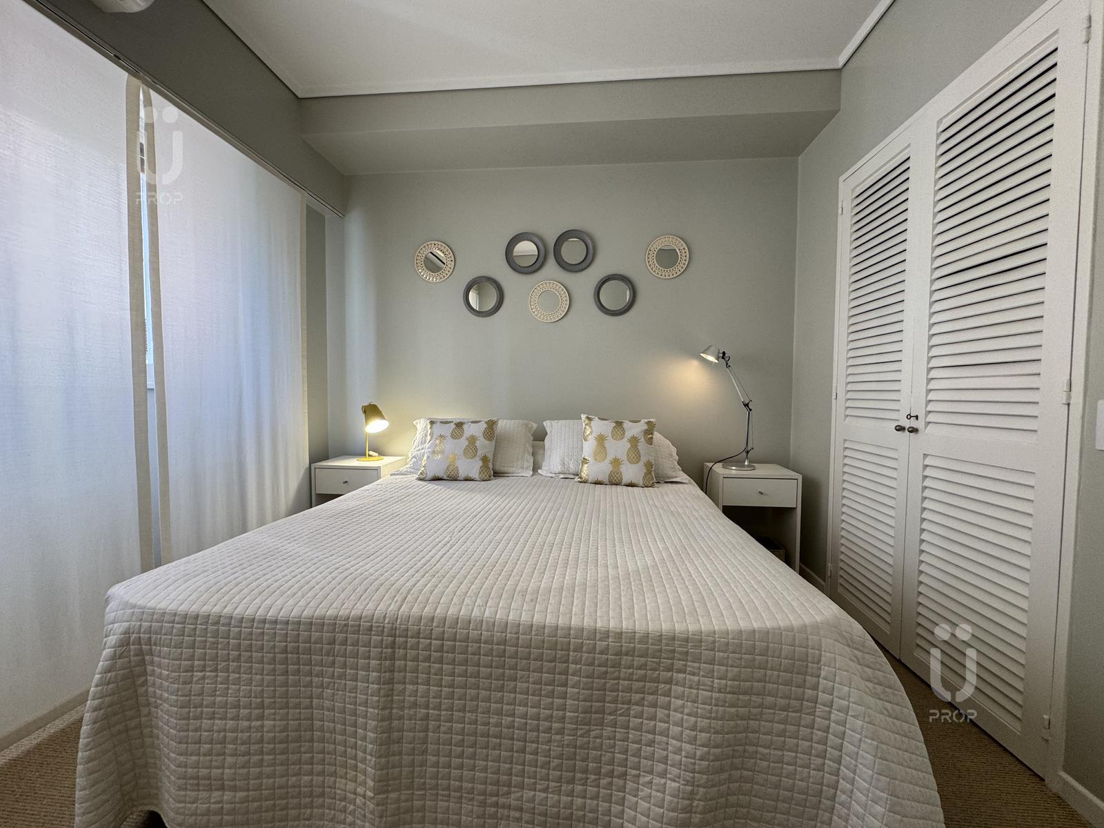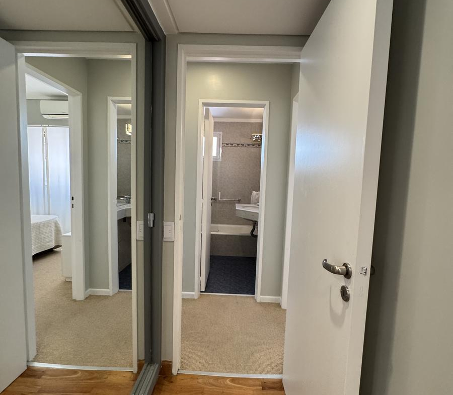 El pasillo de distribución nos conduce al sector de las habitaciones en donde se encuentra un baño completo, con bañera y mampara de vidrio. El dormitorio principal cuenta con cama tipo sommier de dos plazas, mesas de luz con veladores, rack TV smart, ventanas con vista al contra frente de la unidad con excelente luz natural y muy buena circulación de aire. Cuenta con placar empotrado y aire acondicionado split frío calor.