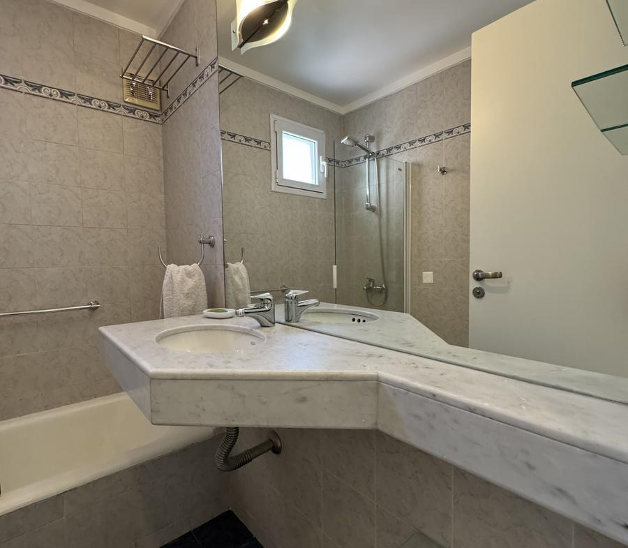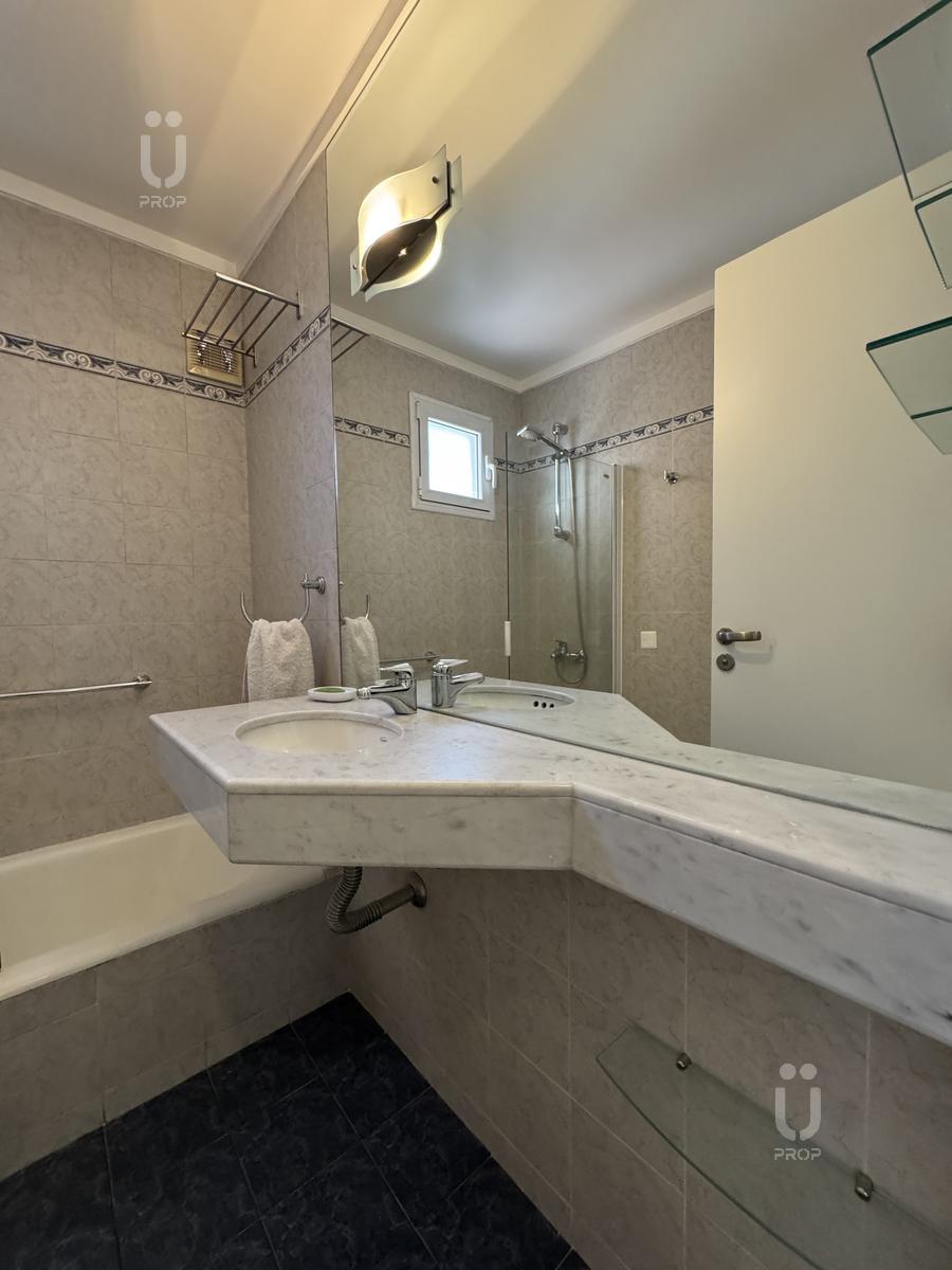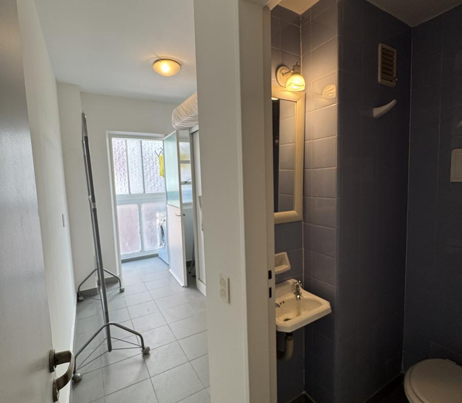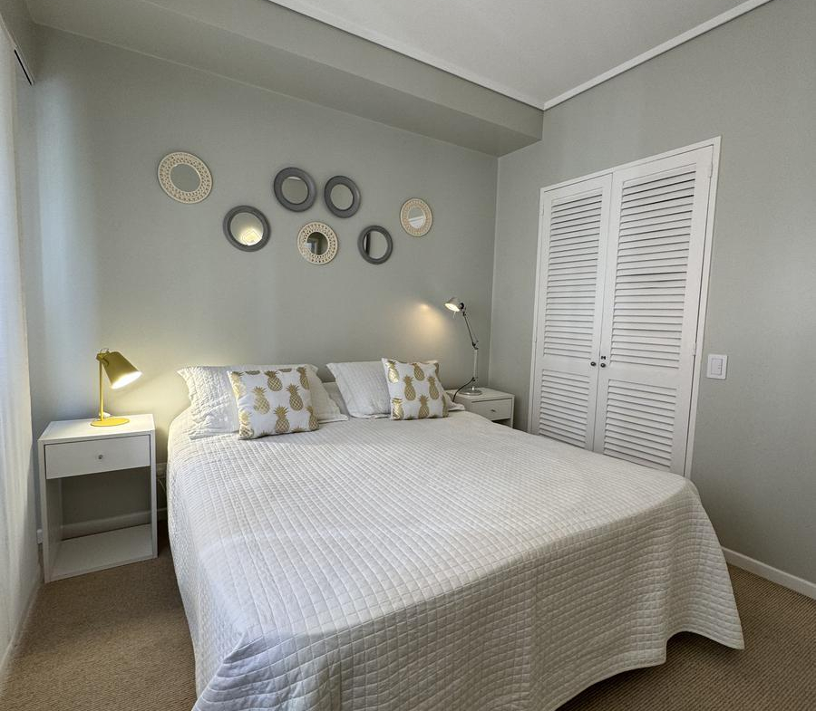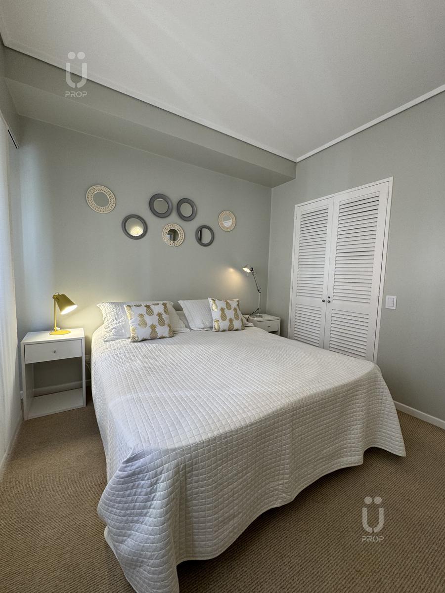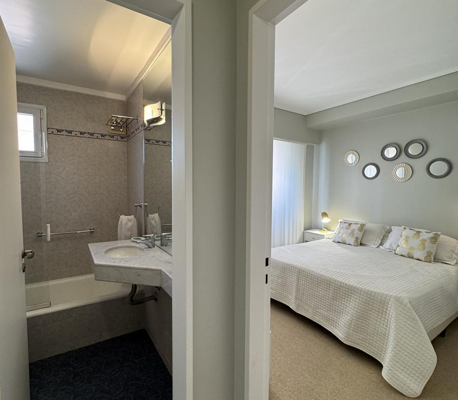 El pasillo de distribución nos conduce al sector de las habitaciones en donde se encuentra un baño completo, con bañera y mampara de vidrio. El dormitorio principal cuenta con cama tipo sommier de dos plazas, mesas de luz con veladores, rack TV smart, ventanas con vista al contra frente de la unidad con excelente luz natural y muy buena circulación de aire. Cuenta con placar empotrado y aire acondicionado split frío calor.