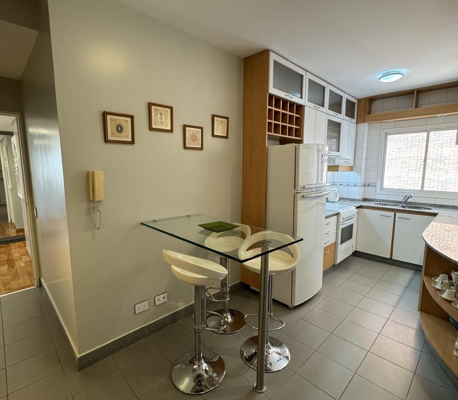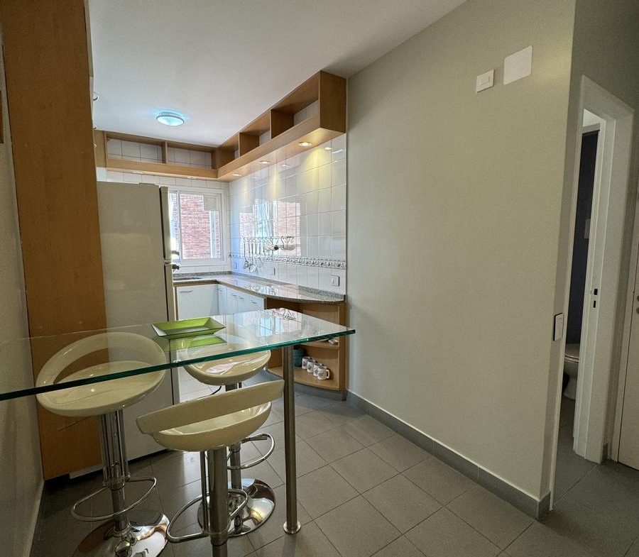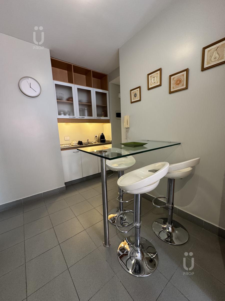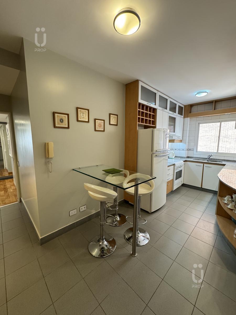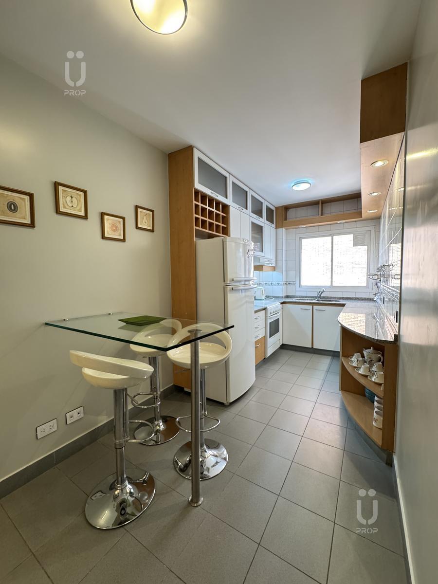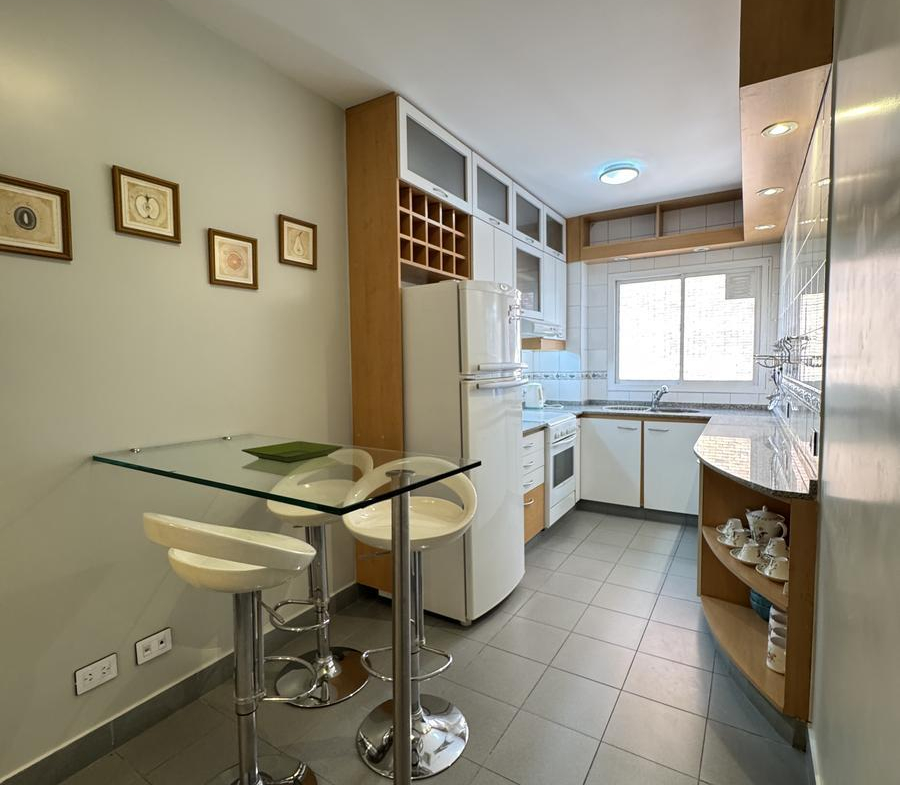 La cocina cuenta con gran espacio de guardado, mesa de desayuno de vidrio con tres banquetas altas de decoración, heladera con freezer, cocina con cuatro hornallas y horno a gas. Posee pava eléctrica, purificador de aire, cafetera y todos los utensilios necesarios para el día a día.