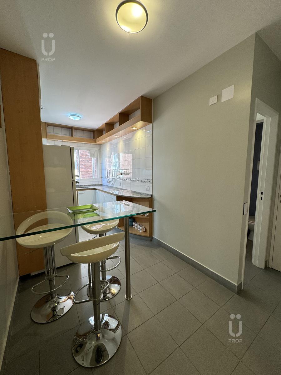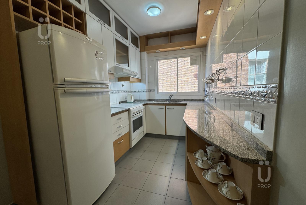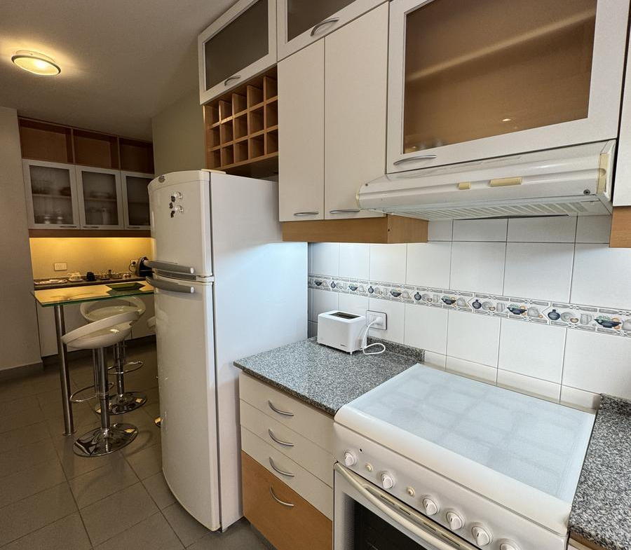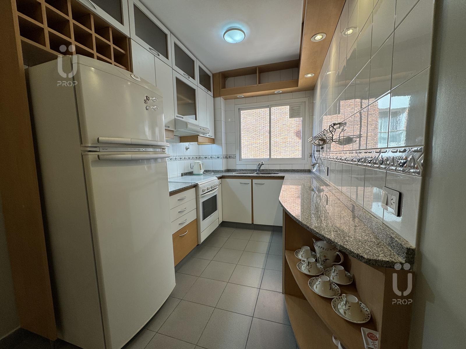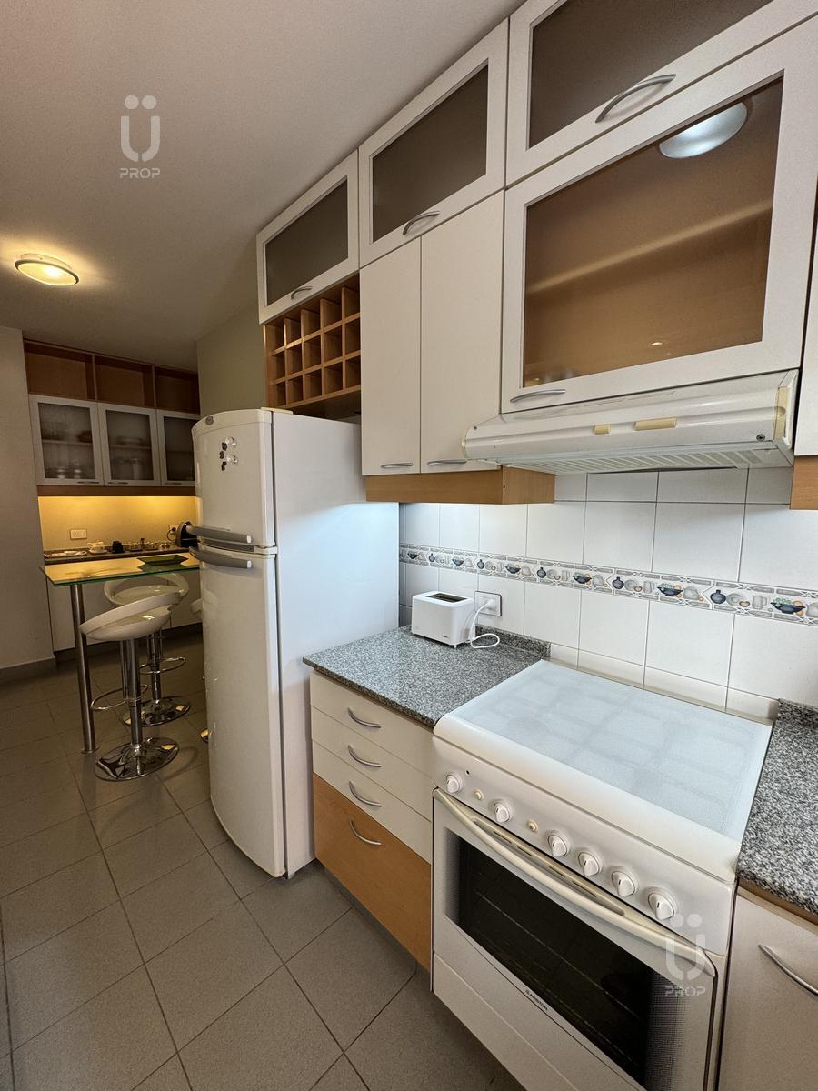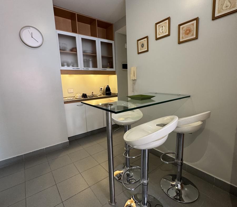 La cocina cuenta con gran espacio de guardado, mesa de desayuno de vidrio con tres banquetas altas de decoración, heladera con freezer, cocina con cuatro hornallas y horno a gas. Posee pava eléctrica, purificador de aire, cafetera y todos los utensilios necesarios para el día a día.