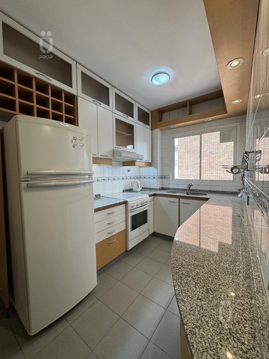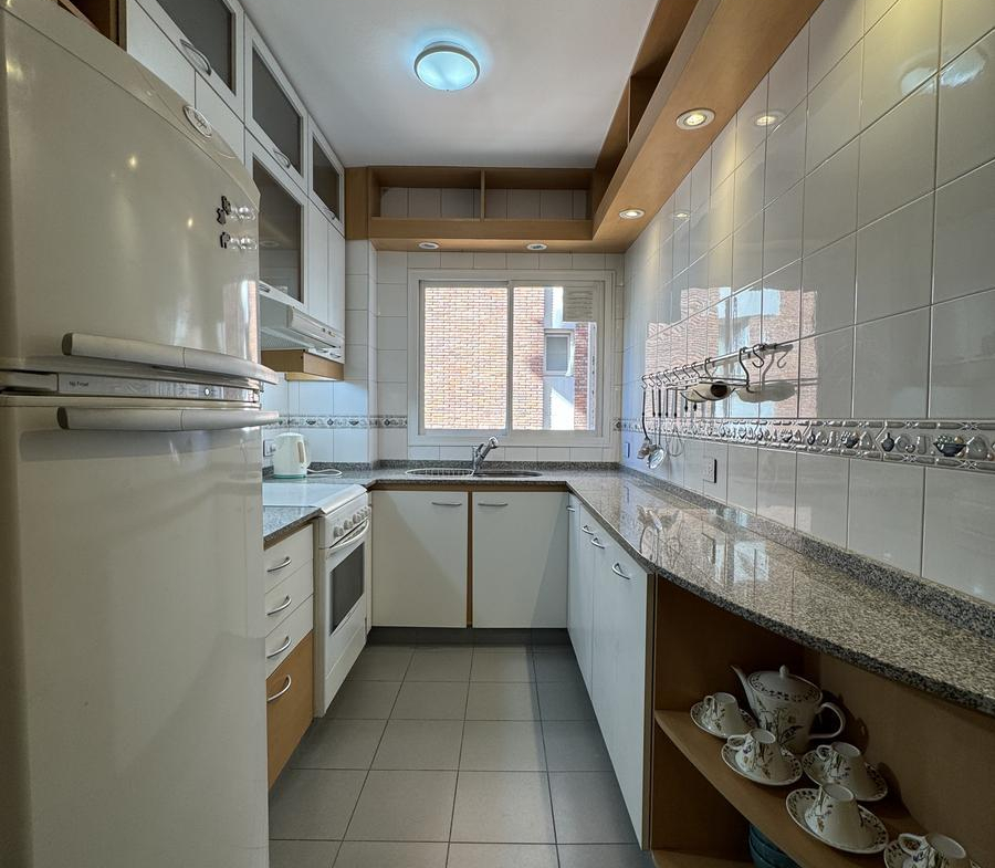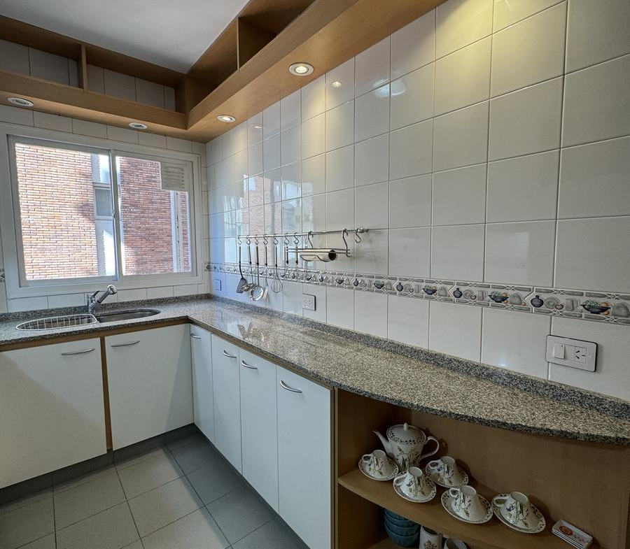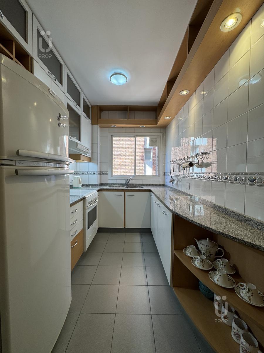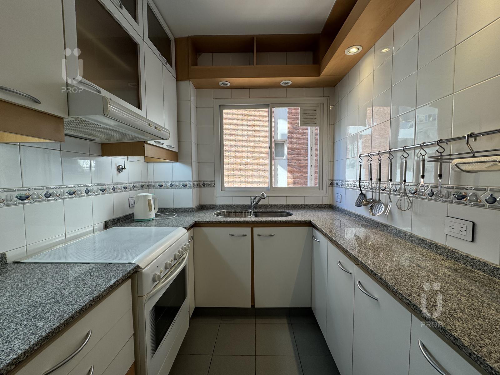 La cocina cuenta con gran espacio de guardado, mesa de desayuno de vidrio con tres banquetas altas de decoración, heladera con freezer, cocina con cuatro hornallas y horno a gas. Posee pava eléctrica, purificador de aire, cafetera y todos los utensilios necesarios para el día a día.