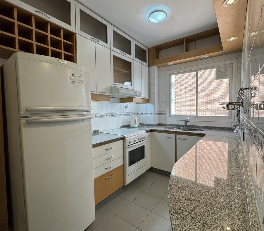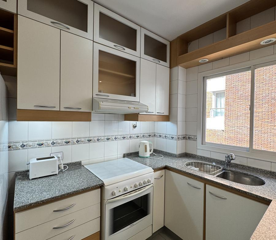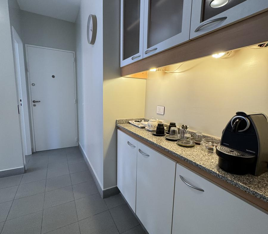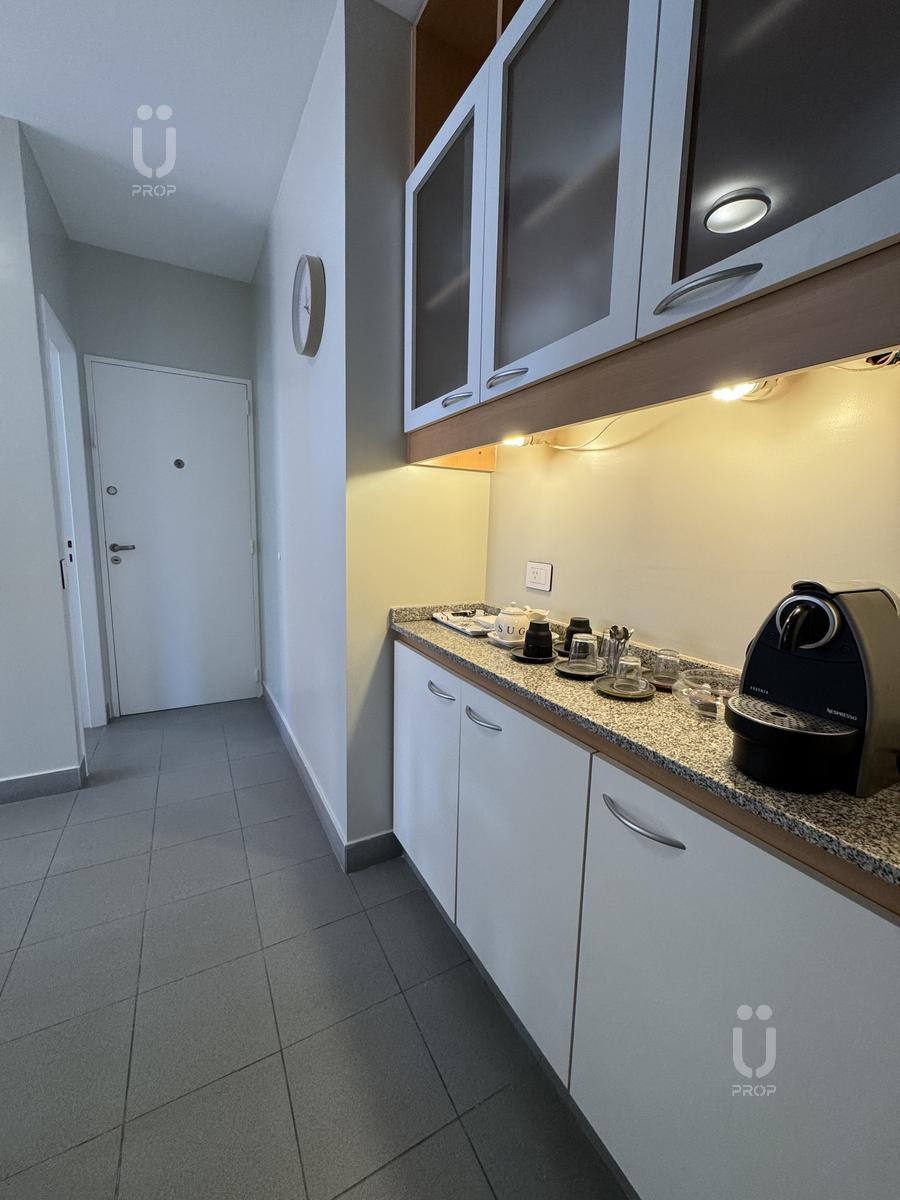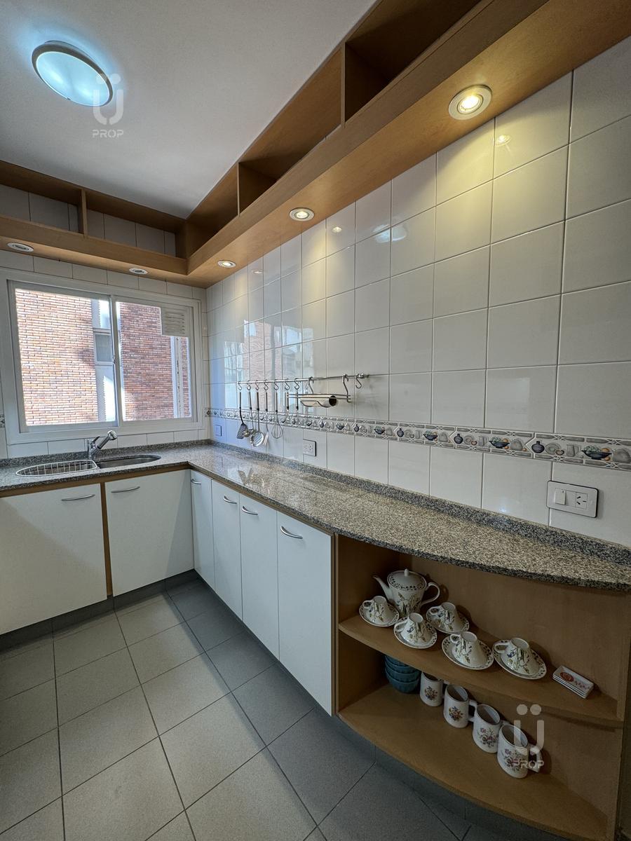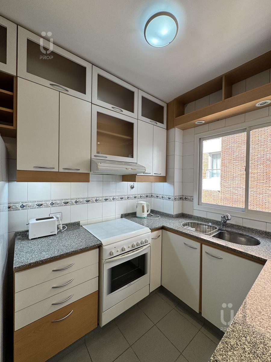 La cocina cuenta con gran espacio de guardado, mesa de desayuno de vidrio con tres banquetas altas de decoración, heladera con freezer, cocina con cuatro hornallas y horno a gas. Posee pava eléctrica, purificador de aire, cafetera y todos los utensilios necesarios para el día a día.