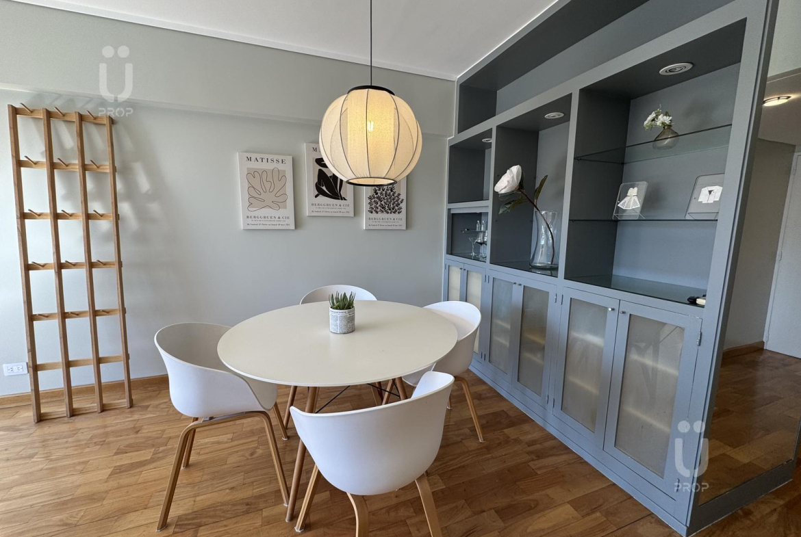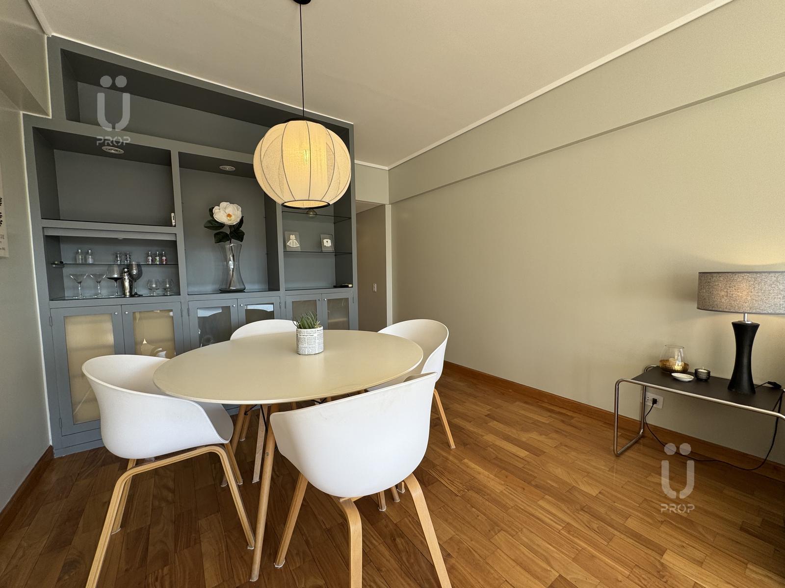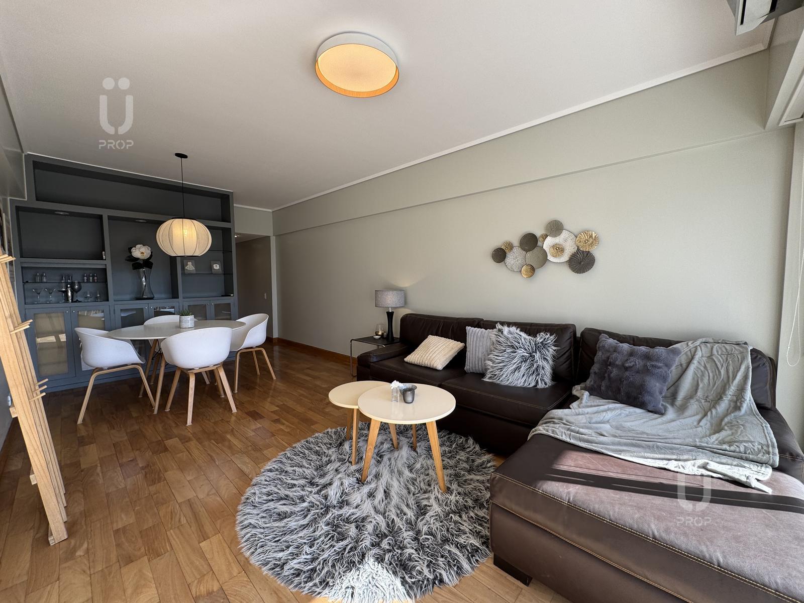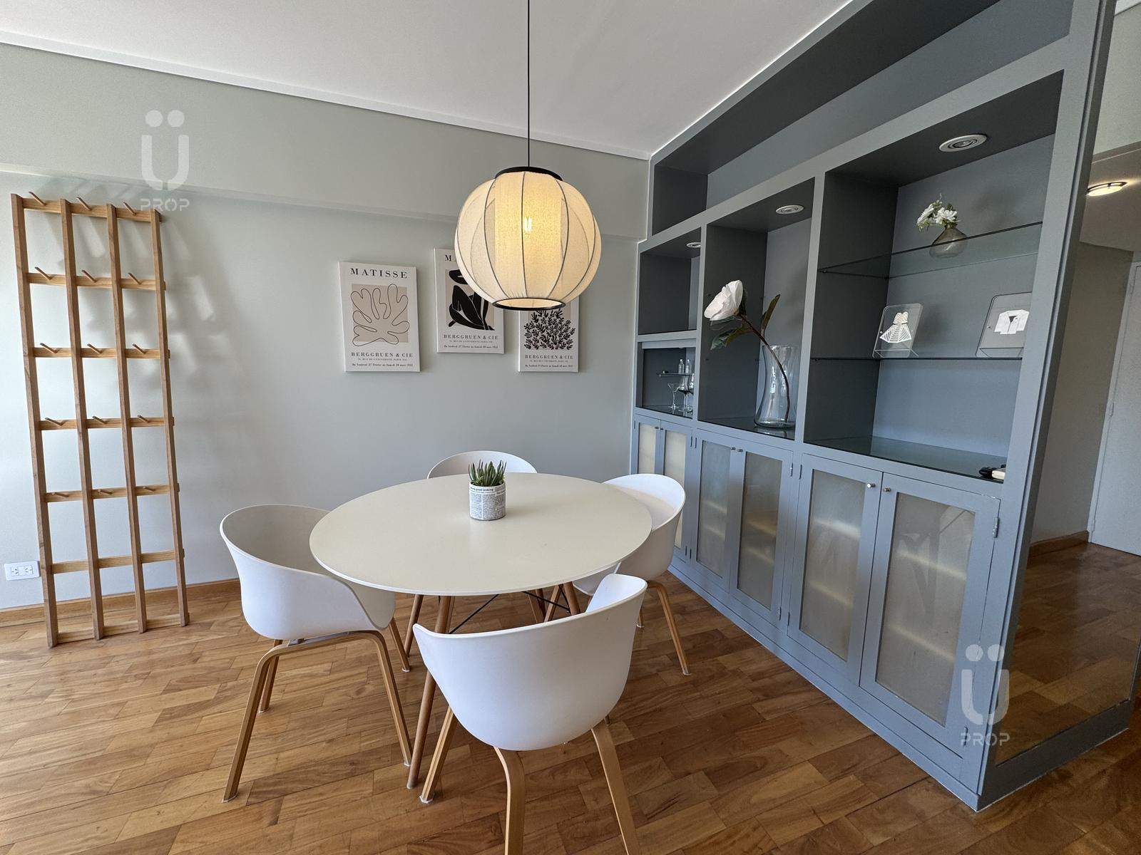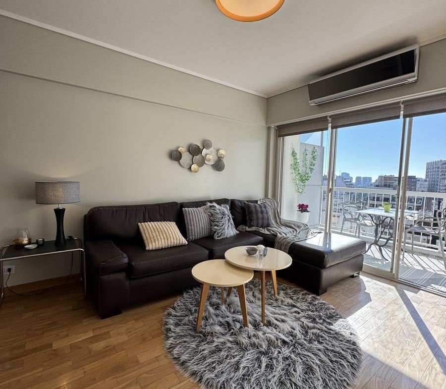 Esta propiedad es un semi piso y cuenta con un amplio living comedor con disposición de L y en el mismo posee un sofá de tres cuerpos muy cómodo con camastro de cuero, alfombra de piso, mesa de centro, mesa ratona con un velador de diseño, mesa nórdica con cuatro sillas, mueble vitrina con copas y artículos de decoración, perchero de pie, aire acondicionado split, Internet Wi Fi, rack TV smart, sillón de dos cuerpos muy cómodo y puertas ventana corredizas con salida al balcón con vista abierta al contra frente de la unidad. Posee increíble luz natural y muy buena circulación de aire. El balcón cuenta con dos juegos de jardín de mesas y sillas.