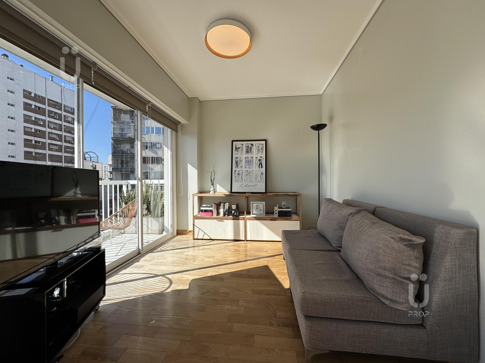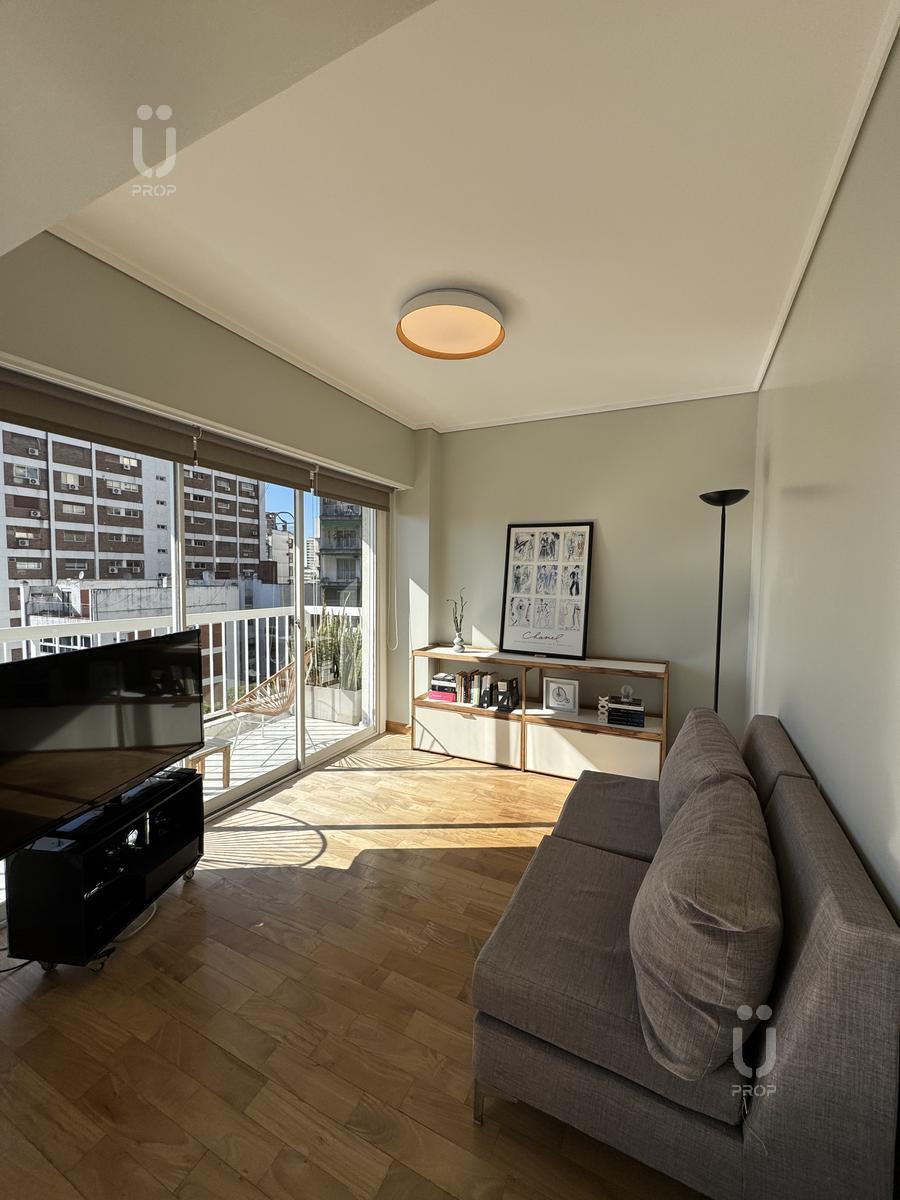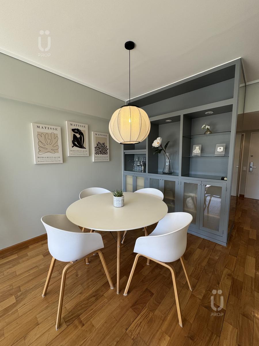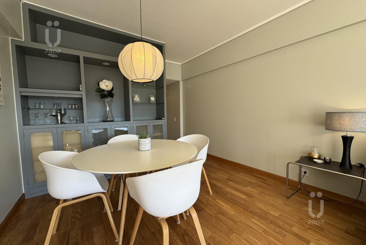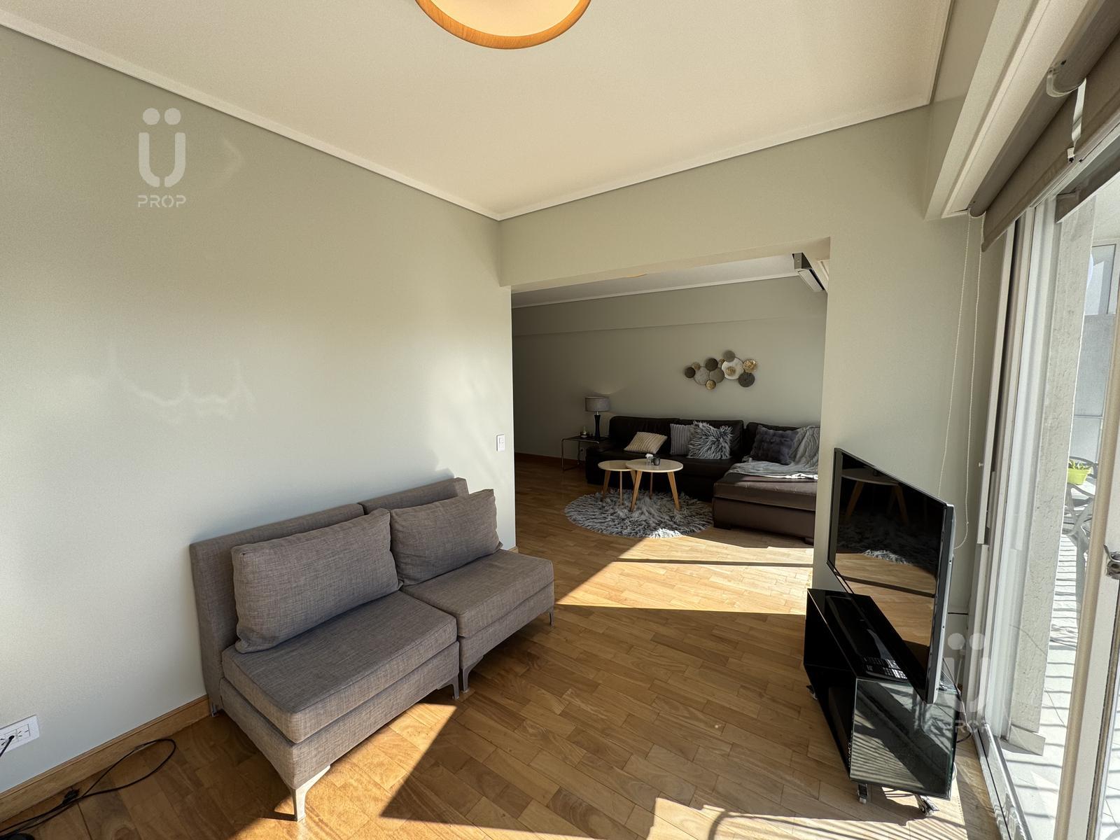 Esta propiedad es un semi piso y cuenta con un amplio living comedor con disposición de L y en el mismo posee un sofá de tres cuerpos muy cómodo con camastro de cuero, alfombra de piso, mesa de centro, mesa ratona con un velador de diseño, mesa nórdica con cuatro sillas, mueble vitrina con copas y artículos de decoración, perchero de pie, aire acondicionado split, Internet Wi Fi, rack TV smart, sillón de dos cuerpos muy cómodo y puertas ventana corredizas con salida al balcón con vista abierta al contra frente de la unidad. Posee increíble luz natural y muy buena circulación de aire. El balcón cuenta con dos juegos de jardín de mesas y sillas.