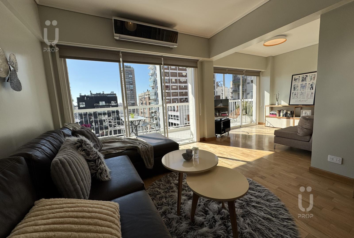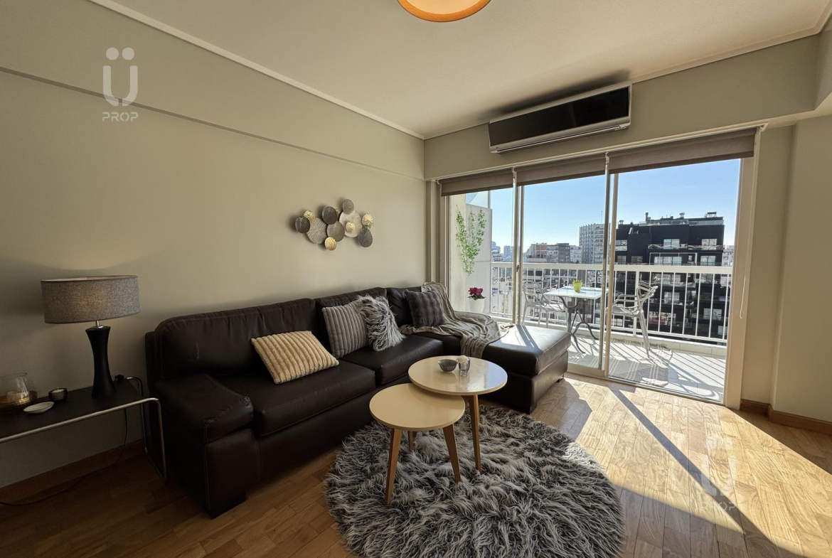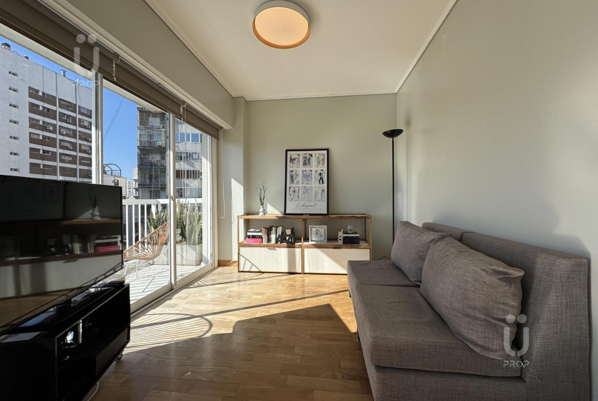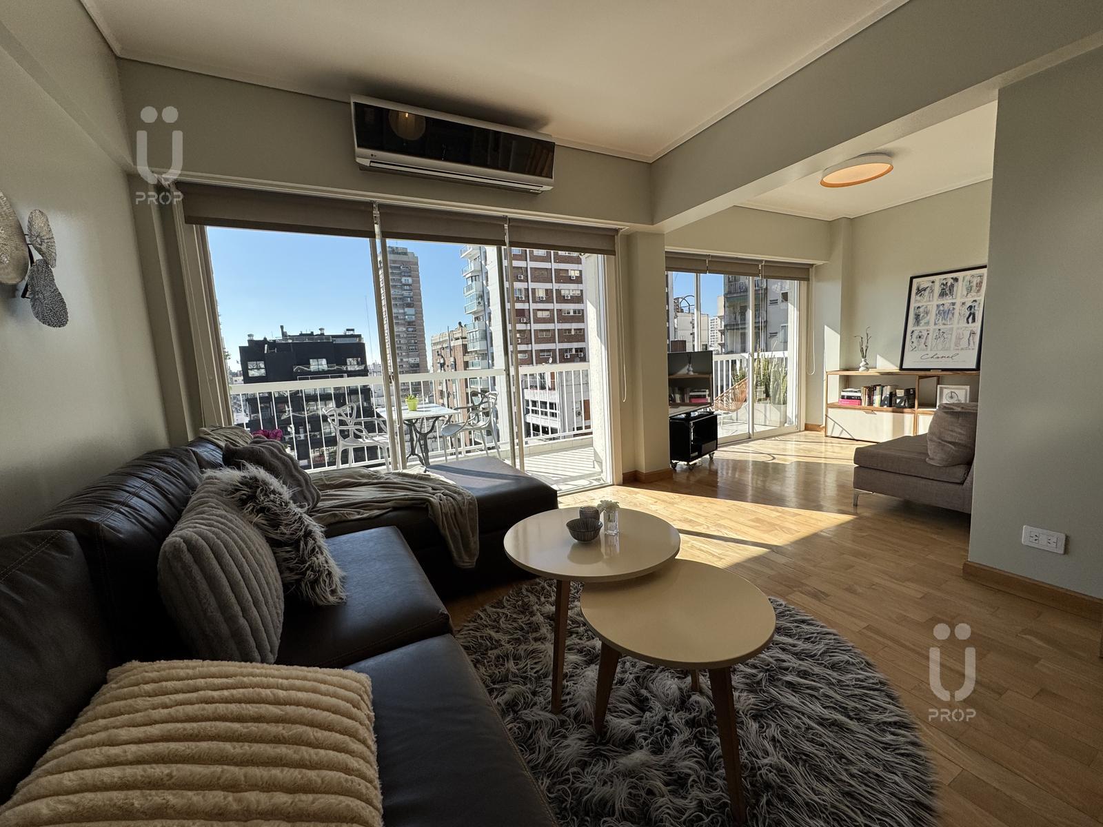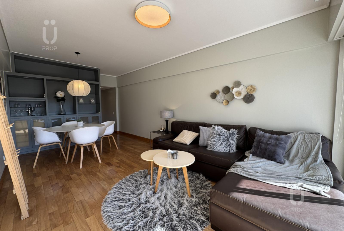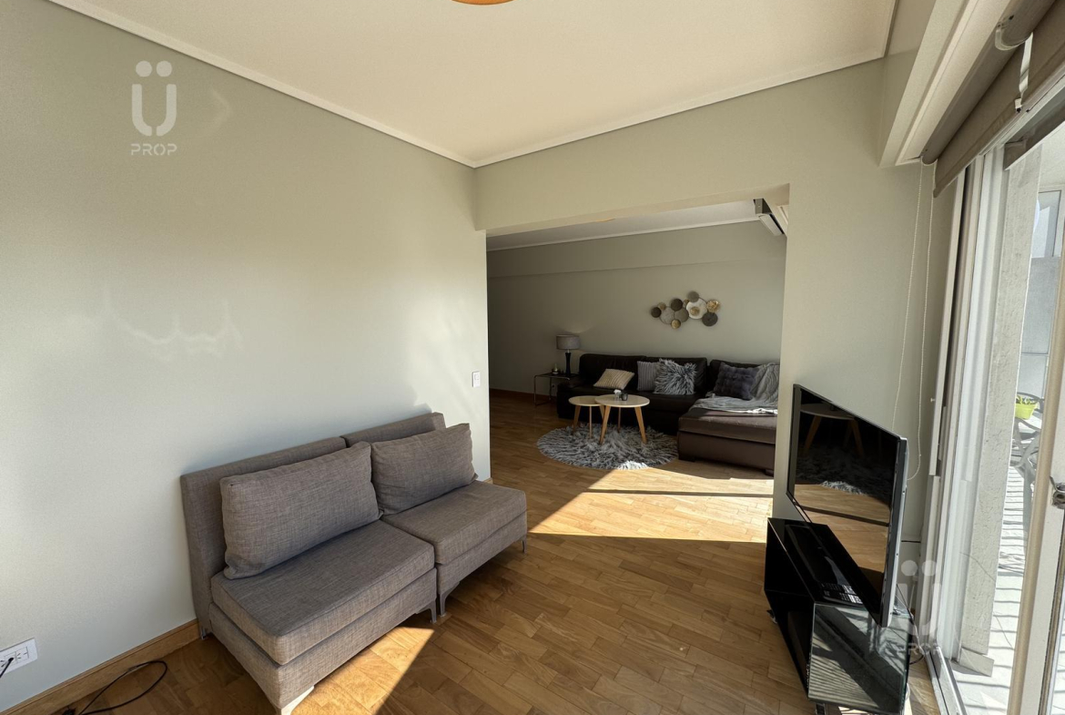 Esta propiedad es un semi piso y cuenta con un amplio living comedor con disposición de L y en el mismo posee un sofá de tres cuerpos muy cómodo con camastro de cuero, alfombra de piso, mesa de centro, mesa ratona con un velador de diseño, mesa nórdica con cuatro sillas, mueble vitrina con copas y artículos de decoración, perchero de pie, aire acondicionado split, Internet Wi Fi, rack TV smart, sillón de dos cuerpos muy cómodo y puertas ventana corredizas con salida al balcón con vista abierta al contra frente de la unidad. Posee increíble luz natural y muy buena circulación de aire. El balcón cuenta con dos juegos de jardín de mesas y sillas.
