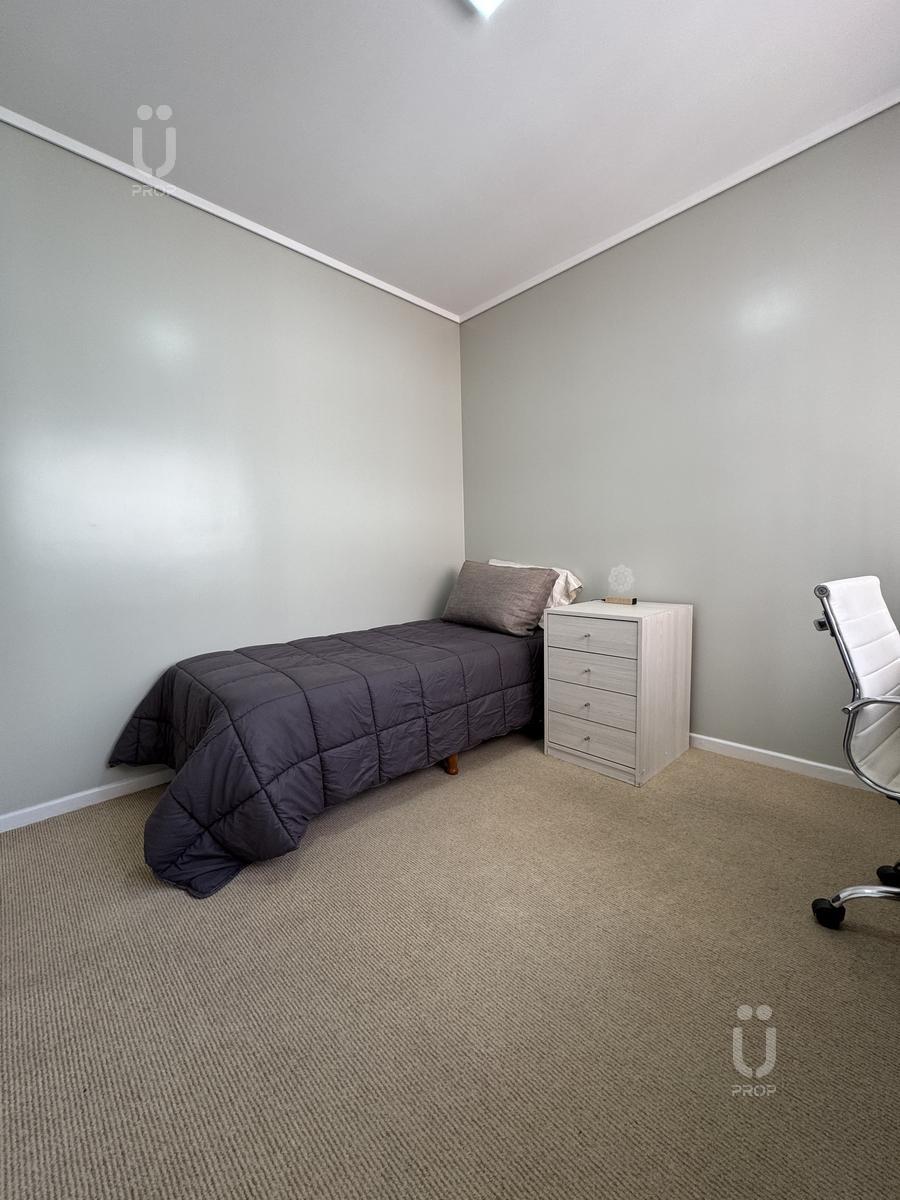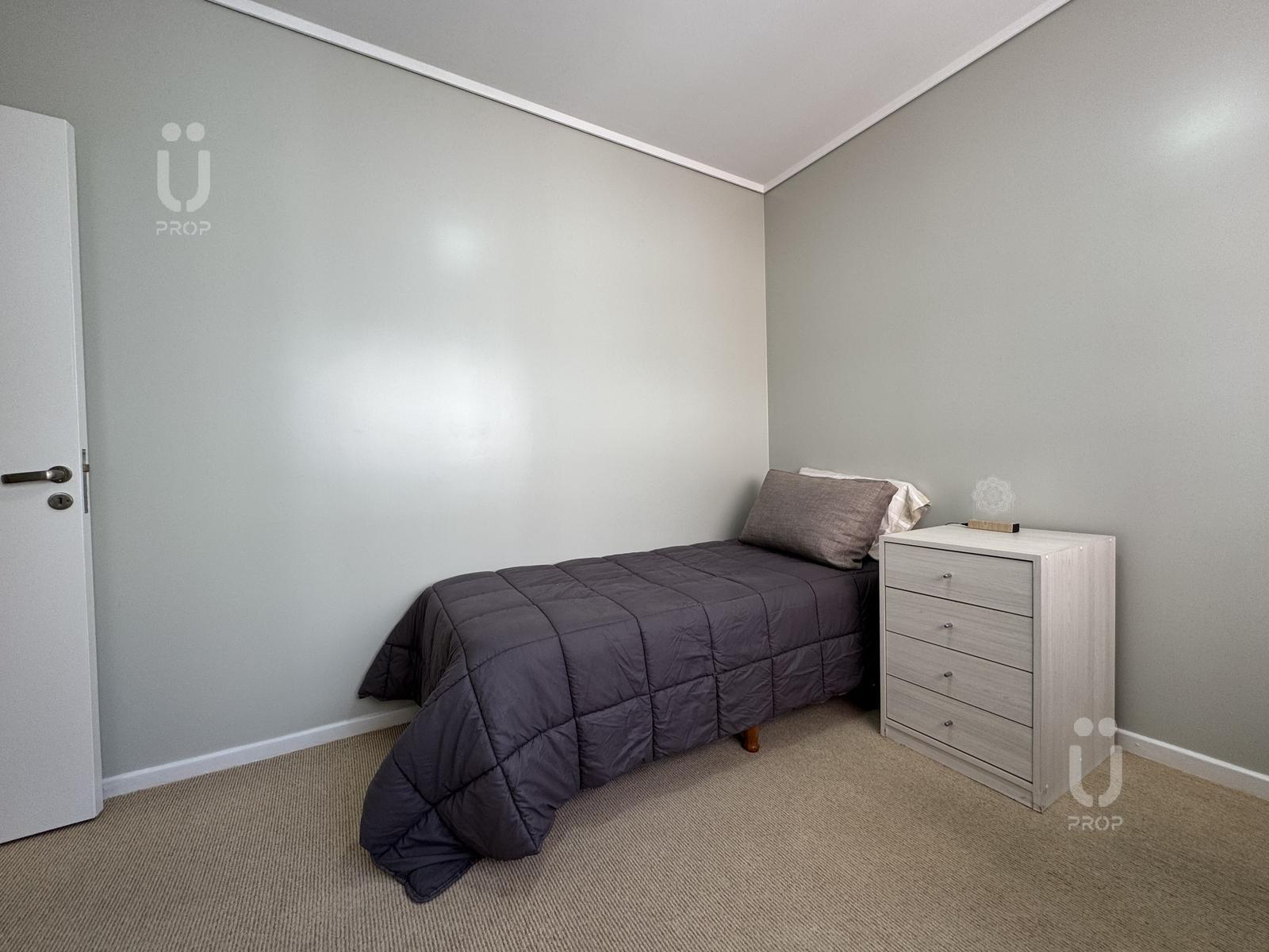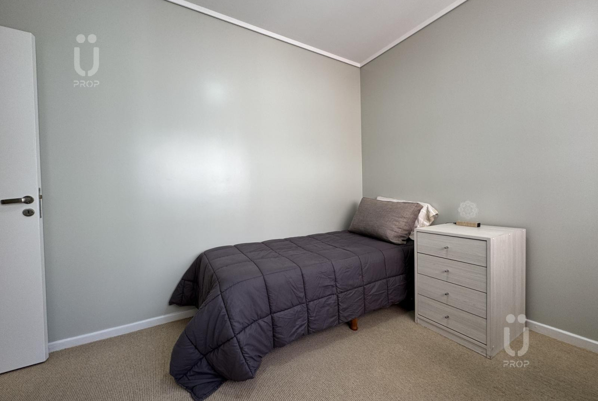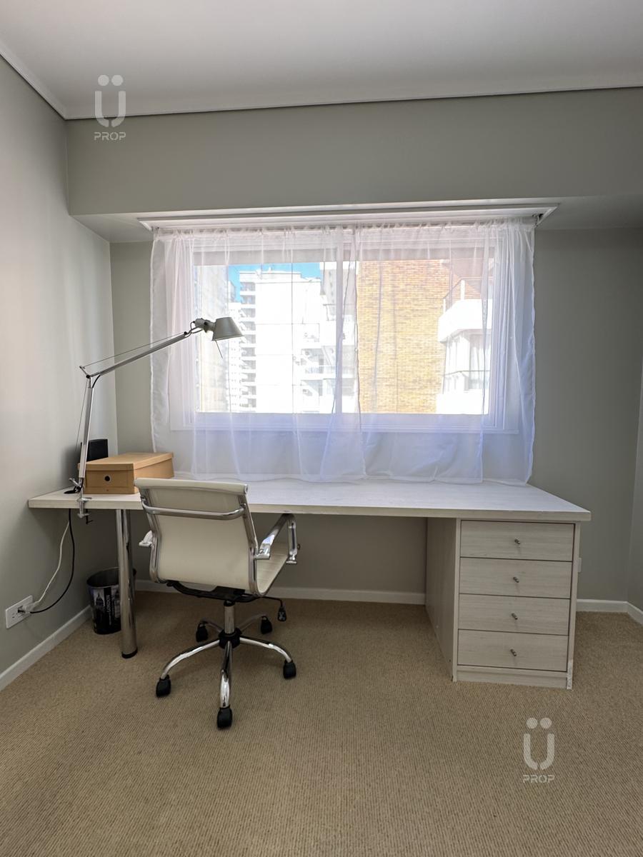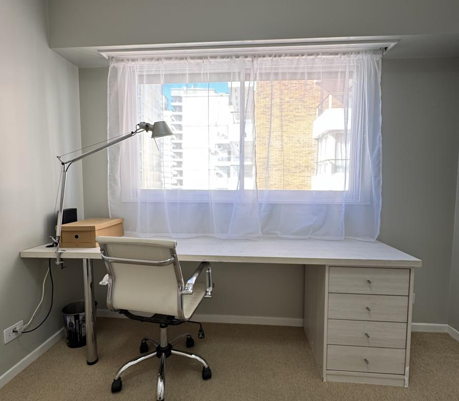 El dormitorio secundario cuenta con cama tipo sommier de una plaza y mesa de luz con veladores. Ideal para trabajar desde el hogar, con su respectiva lámpara y mesa de escritorio. Cuenta con placar empotrado con gran espacio de guardado, ventanas con vista al contra frente de la unidad, lo que proporciona excelente luz natural y muy buena circulación de aire. Posee un toilette de uso social en el sector del living cerca del pasillo que nos conduce a la cocina.